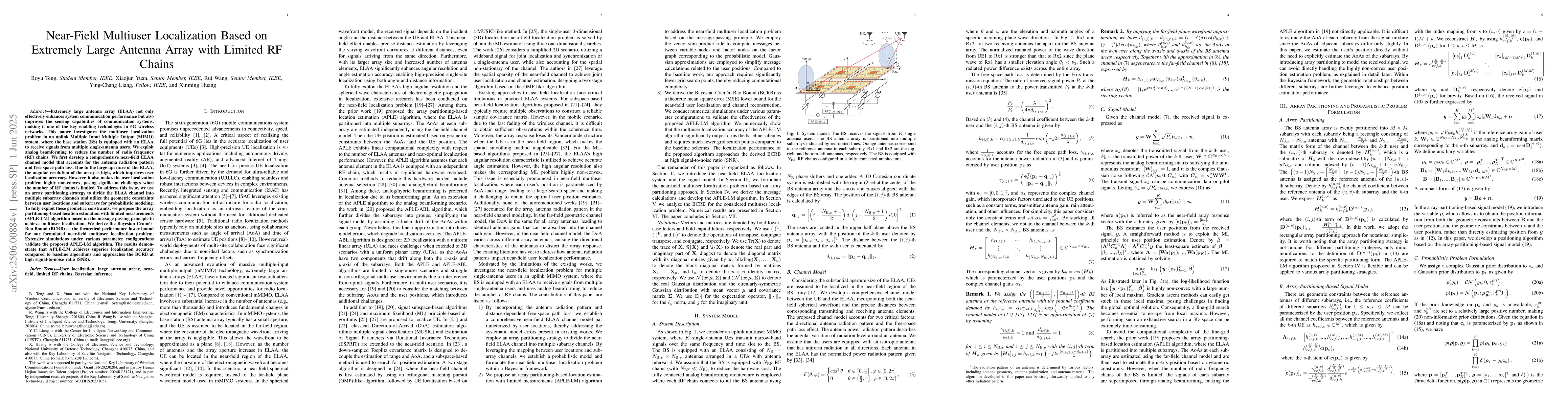 The paper presents an array partitioning-based location estimation algorithm (APLE-LM) for near-field multiuser localization using ELAA with limited RF chains, along with a comprehensive near-field ELAA channel model.