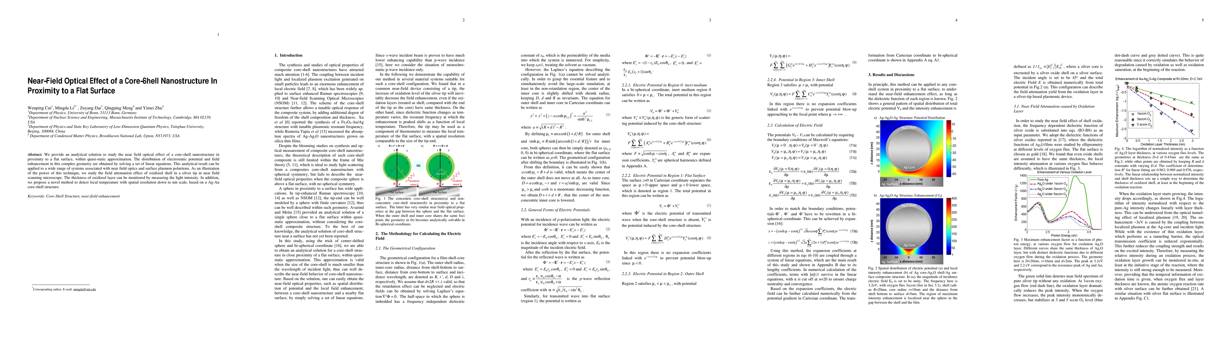 The paper presents an analytical solution for the near-field optical effect of a core-shell nanostructure near a flat surface, using quasi-static approximation. It demonstrates applications in monitoring oxidized layer thickness via light intensity measurement and proposes a novel method for nm-scale temperature detection using an Ag-Au core-shell structure.