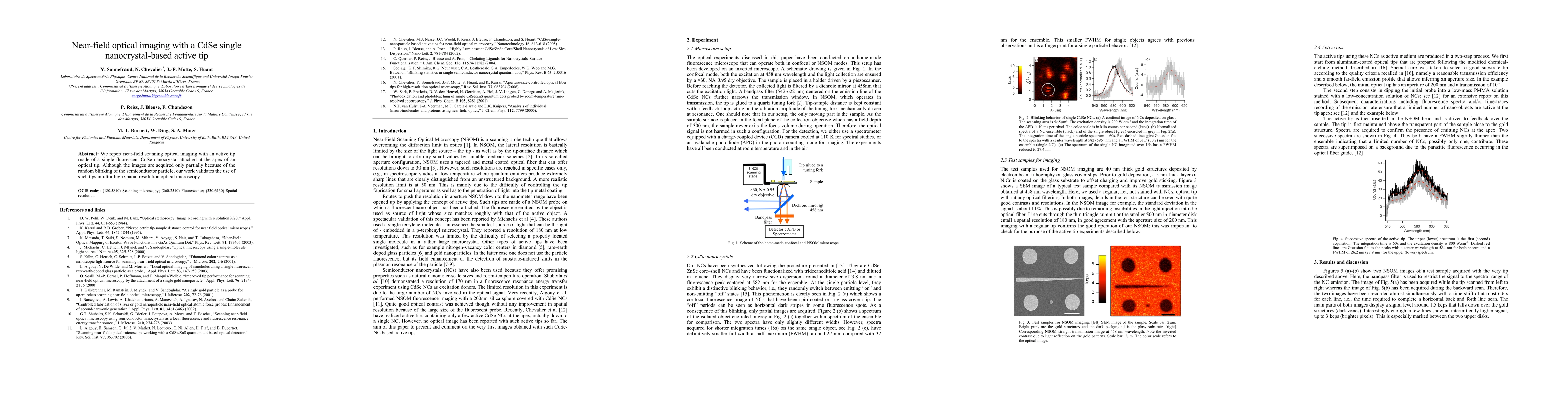 This paper demonstrates near-field scanning optical imaging using an active tip composed of a single fluorescent CdSe nanocrystal, achieving ultra-high spatial resolution despite partial image acquisition due to the nanocrystal's blinking. The study validates the potential of such tips for advanced optical microscopy.