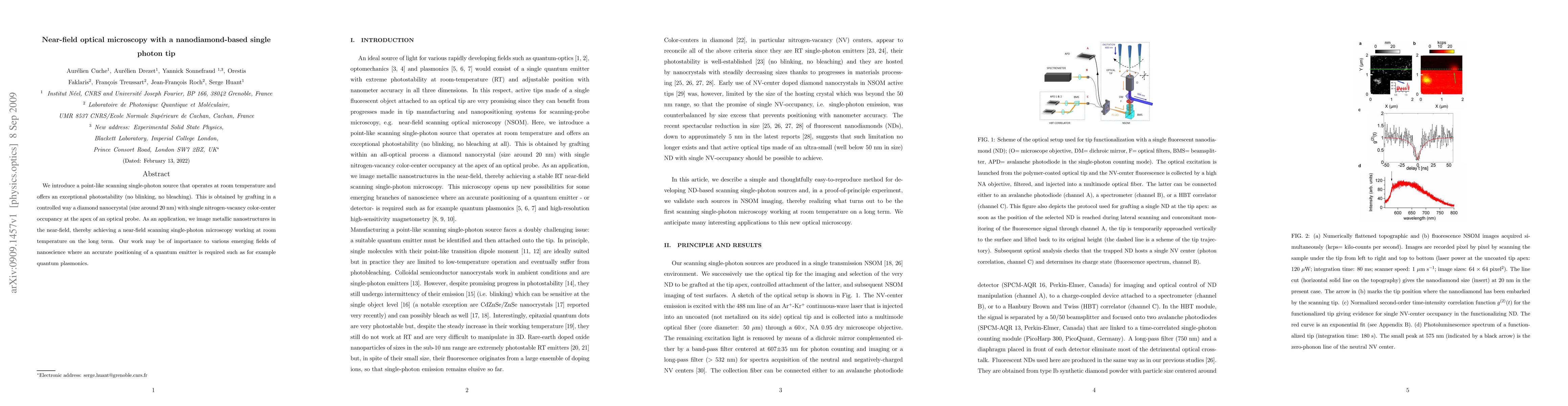 This paper presents a nanodiamond-based single photon tip for near-field optical microscopy, achieving stable single-photon emission at room temperature. The technique enables long-term imaging of metallic nanostructures, with potential applications in quantum plasmonics and other nanoscience fields requiring precise quantum emitter positioning.