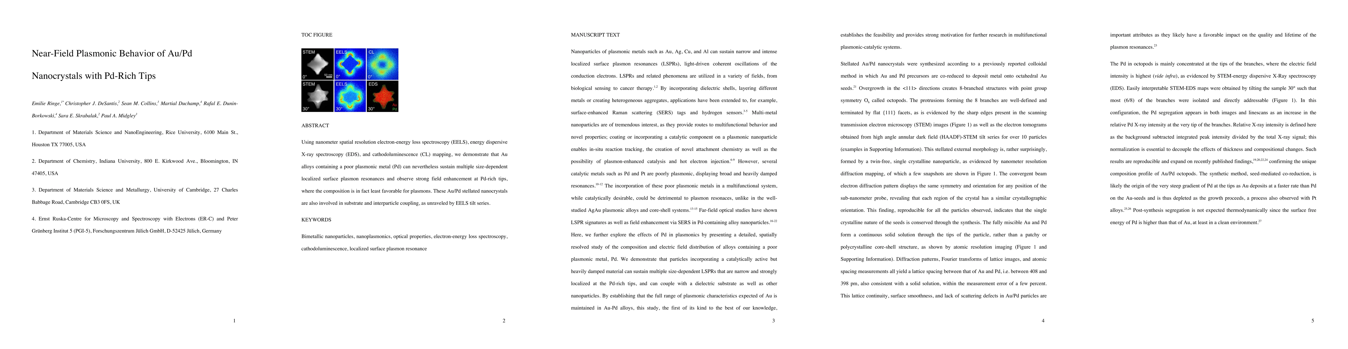 This study reveals that Au/Pd nanocrystals sustain multiple localized surface plasmon resonances and exhibit strong field enhancement at Pd-rich tips, despite the composition being less favorable for plasmons, using advanced spectroscopic techniques. These findings also show the role of substrate and interparticle coupling in the plasmonic behavior of these stellated nanocrystals.