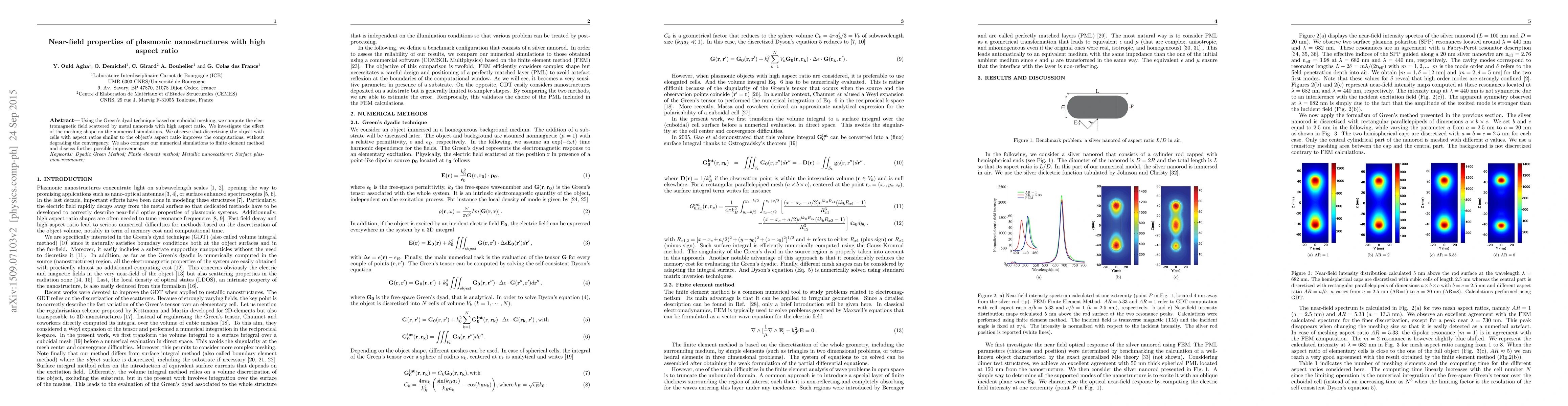 Using the Green's dyad technique based on cuboidal meshing, we compute the electromagnetic field scattered by metal nanorods with high aspect ratio. We investigate the effect of the meshing shape on the numerical simulations. We observe that discretizing the object with cells with aspect ratios similar to the object's aspect ratio improves the computations, without degrading the convergency. We also compare our numerical simulations to finite element method and discuss further possible improvements.