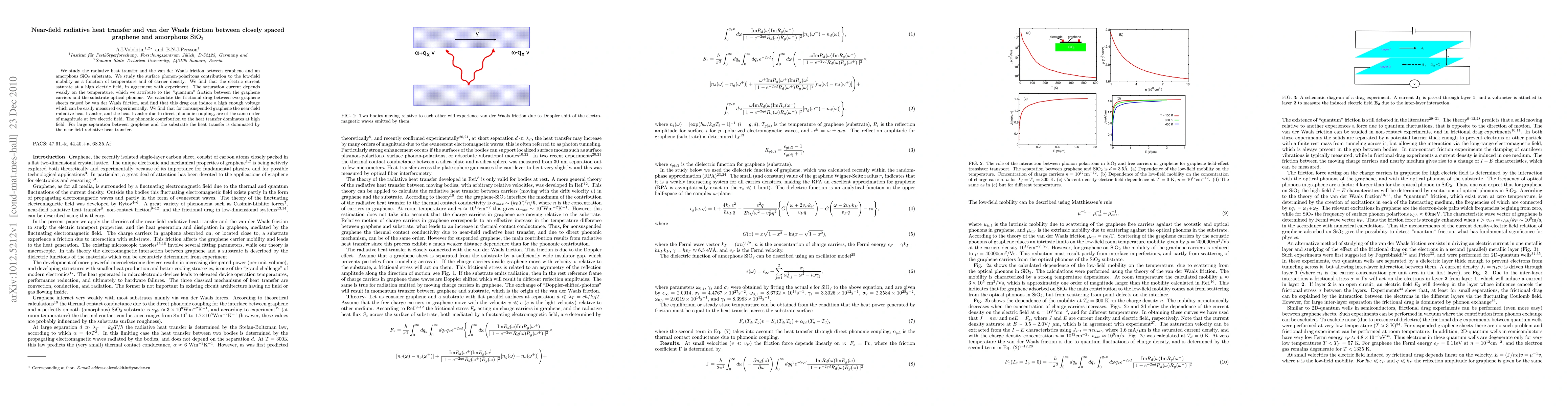 This paper investigates the near-field radiative heat transfer and van der Waals friction between graphene and amorphous SiO$_2$. It finds that the radiative heat transfer and phononic coupling are comparable at low electric fields, while phononic coupling dominates at high fields, and the frictional drag can induce measurable voltages.
