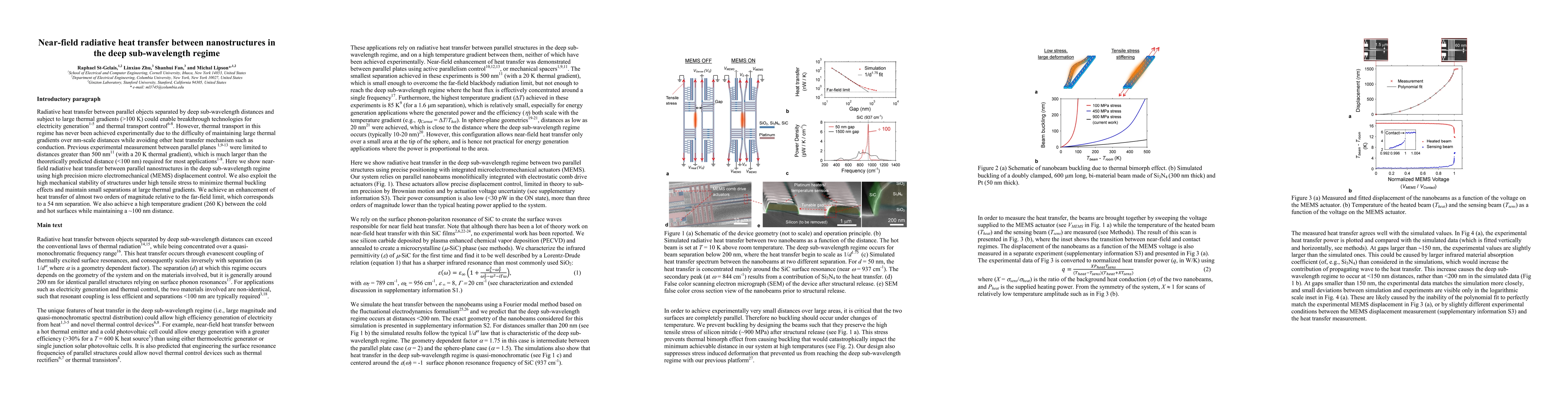 This paper demonstrates near-field radiative heat transfer between parallel nanostructures at deep sub-wavelength separations, achieving a two-order-of-magnitude enhancement over far-field limits and maintaining a 260 K thermal gradient over a 54 nm gap using MEMS technology.