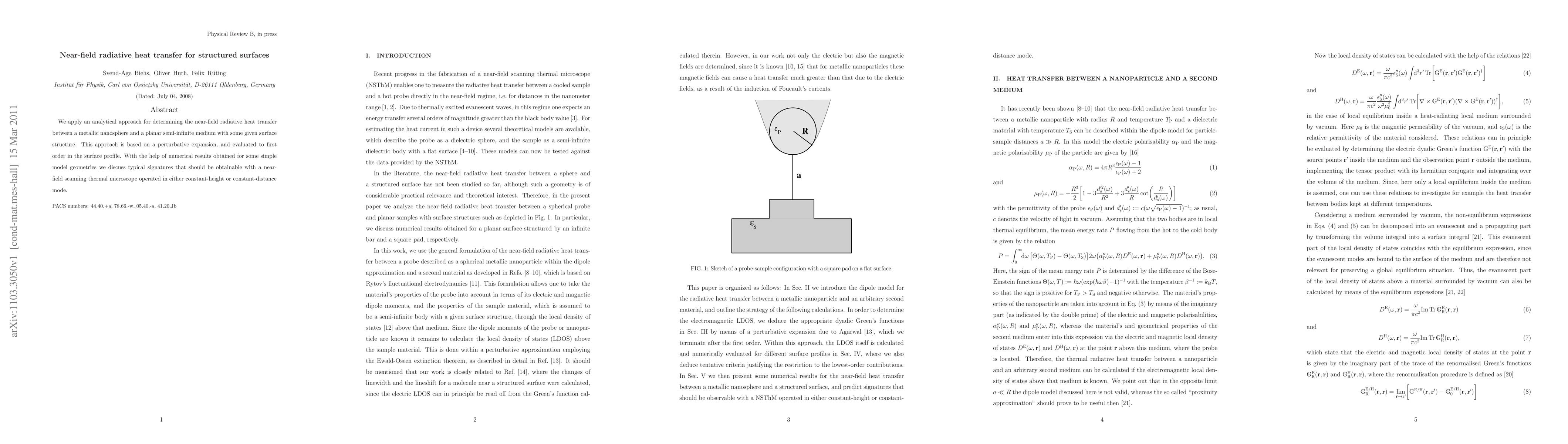 This paper develops an analytical method to calculate near-field radiative heat transfer between a metallic nanosphere and a structured planar surface, employing a perturbative expansion. It provides insights into potential signatures detectable by a near-field scanning thermal microscope.