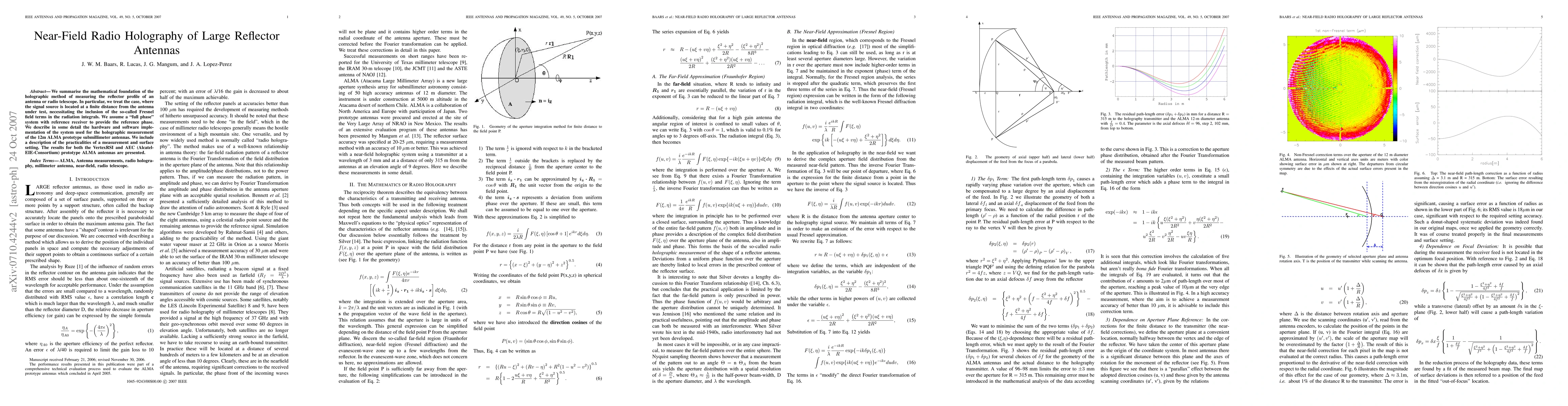 We summarise the mathematical foundation of the holographic method of measuring the reflector profile of an antenna or radio telescope. In particular, we treat the case, where the signal source is located at a finite distance from the antenna under test, necessitating the inclusion of the so-called Fresnel field terms in the radiation integrals. We assume a ``full phase'' system with reference receiver to provide the reference phase. We describe in some detail the hardware and software implementation of the system used for the holographic measurement of the 12m ALMA prototype submillimeter antennas. We include a description of the practicalities of a measurement and surface setting. The results for both the VertexRSI and AEC (Alcatel-EIE-Consortium) prototype ALMA antennas are presented.
