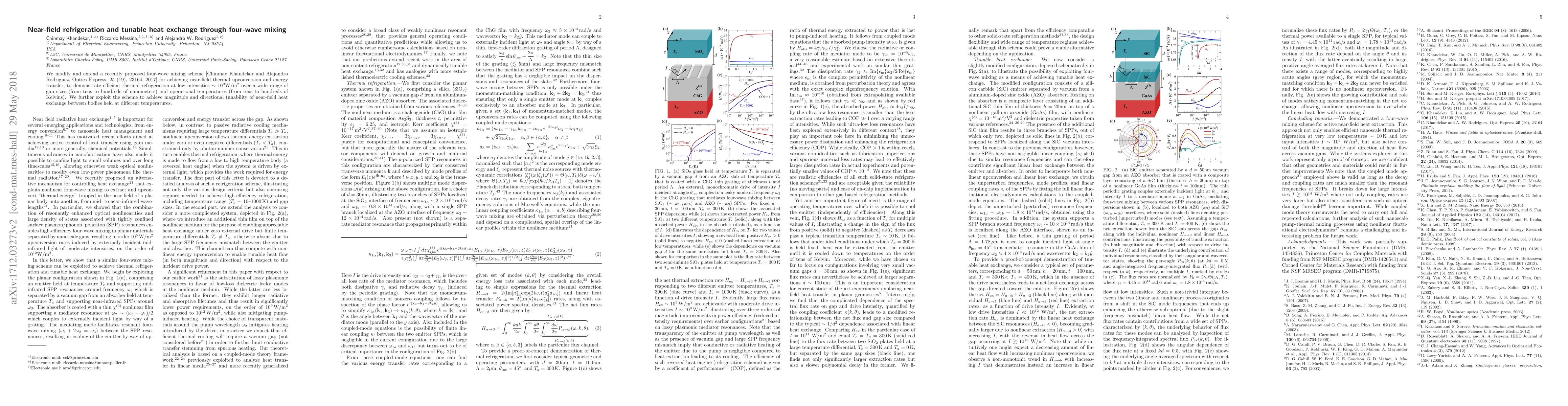 We modify and extend a recently proposed four-wave mixing scheme [Opt. Express 25 (19),23164 (2017)] for achieving near-field thermal upconversion and energy transfer, to demonstrate efficient thermal refrigeration at low intensities $\sim 10^{-9}$W/m$^2$ over a wide range of gap sizes (from tens to hundreds of nanometers) and operational temperatures (from tens to hundreds of Kelvins). We further exploit the scheme to achieve magnitude and directional tunability of near-field heat exchange between bodies held at different temperatures.