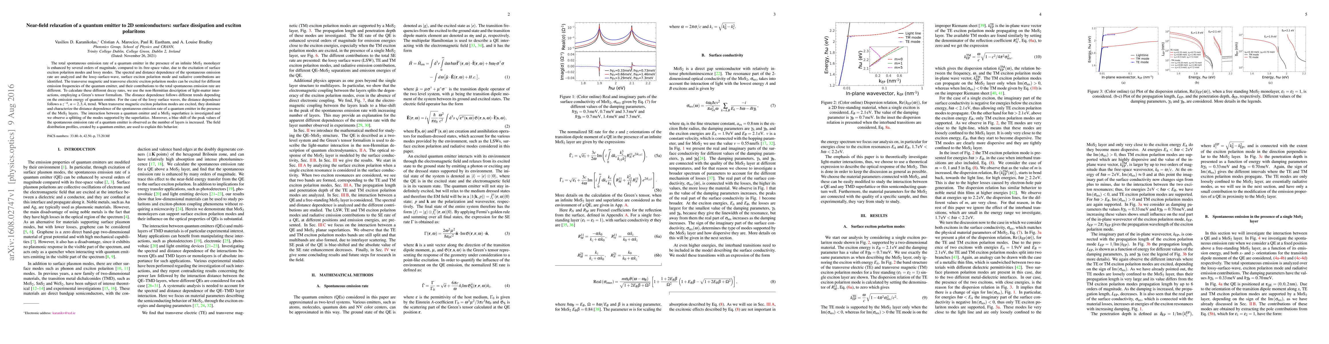 The total spontaneous emission rate of a quantum emitter in the presence of an infinite MoS\textsubscript{2} monolayer is enhanced by several orders of magnitude, compared to its free-space value, due to the excitation of surface exciton polariton modes and lossy modes. The spectral and distance dependence of the spontaneous emission rate are analyzed and the lossy-surface-wave, surface exciton polariton mode and radiative contributions are identified. The transverse magnetic and transverse electric exciton polariton modes can be excited for different emission frequencies of the quantum emitter, and their contributions to the total spontaneous emission rate are different. To calculate these different decay rates, we use the non-Hermitian description of light-matter interactions, employing a Green's tensor formalism. The distance dependence follows different trends depending on the emission energy of quantum emitter. For the case of the lossy surface waves, the distance dependence follows a $z^{-n}$, $n=2,3,4$, trend. When transverse magnetic exciton polariton modes are excited, they dominate and characterize the distance dependence of the spontaneous emission rate of a quantum emitter in the presence of the MoS\textsubscript{2} layers. The interaction between a quantum emitter and a MoS\textsubscript{2} superlattice is investigated and we observe a splitting of the modes supported by the superlattice. Moreover, a blue shift of the peak values of the spontaneous emission rate of a quantum emitter is observed as the number of layers is increased. The field distribution profiles, created by a quantum emitter, are used to explain this behavior.