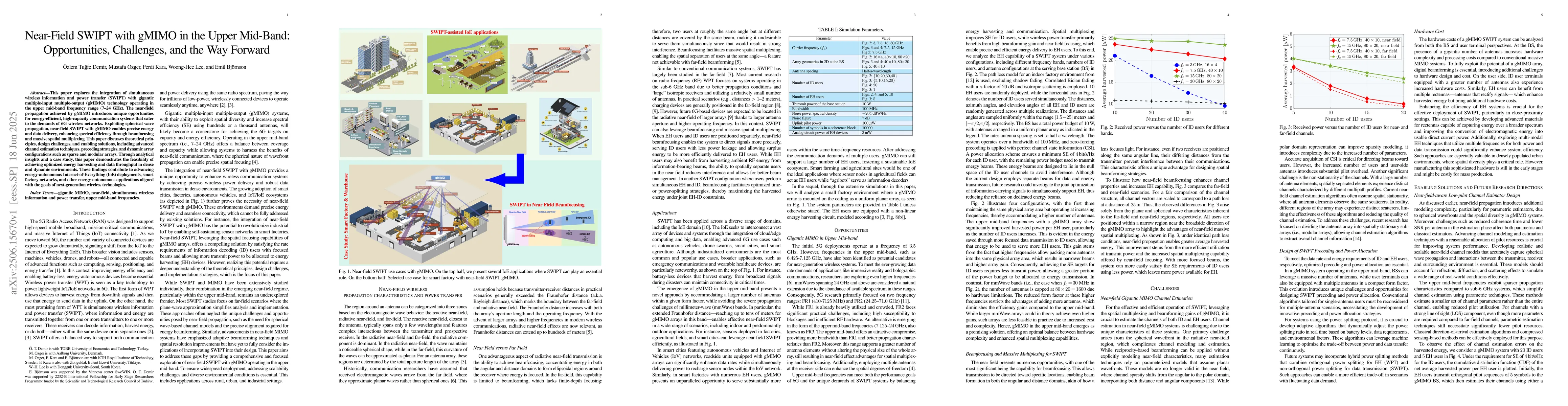 This paper explores the integration of simultaneous wireless information and power transfer (SWIPT) with gigantic multiple-input multiple-output (gMIMO) technology operating in the upper mid-band frequency range (7-24 GHz). The near-field propagation achieved by gMIMO introduces unique opportunities for energy-efficient, high-capacity communication systems that cater to the demands of 6G wireless networks. Exploiting spherical wave propagation, near-field SWIPT with gMIMO enables precise energy and data delivery, enhancing spectral efficiency through beamfocusing and massive spatial multiplexing. This paper discusses theoretical principles, design challenges, and enabling solutions, including advanced channel estimation techniques, precoding strategies, and dynamic array configurations such as sparse and modular arrays. Through analytical insights and a case study, this paper demonstrates the feasibility of achieving optimized energy harvesting and data throughput in dense and dynamic environments. These findings contribute to advancing energy-autonomous Internet-of-Everything (IoE) deployments, smart factory networks, and other energy-autonomous applications aligned with the goals of next-generation wireless technologies.