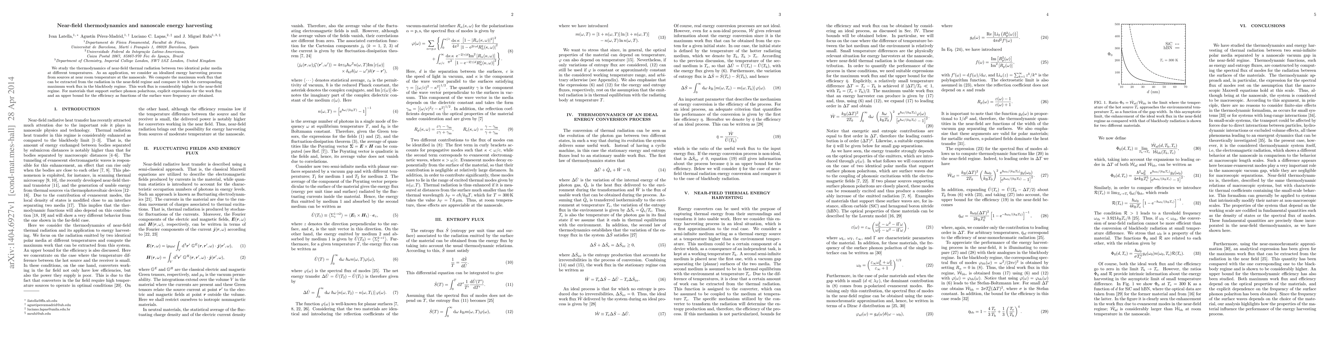 We study the thermodynamics of near-field thermal radiation between two identical polar media at different temperatures. As an application, we consider an idealized energy harvesting process from sources at near room temperature at the nanoscale. We compute the maximum work flux that can be extracted from the radiation in the near-field regime and compare it with the corresponding maximum work flux in the blackbody regime. This work flux is considerably higher in the near-field regime. For materials that support surface phonon polaritons, explicit expressions for the work flux and an upper bound for the efficiency as functions of the surface wave frequency are obtained.