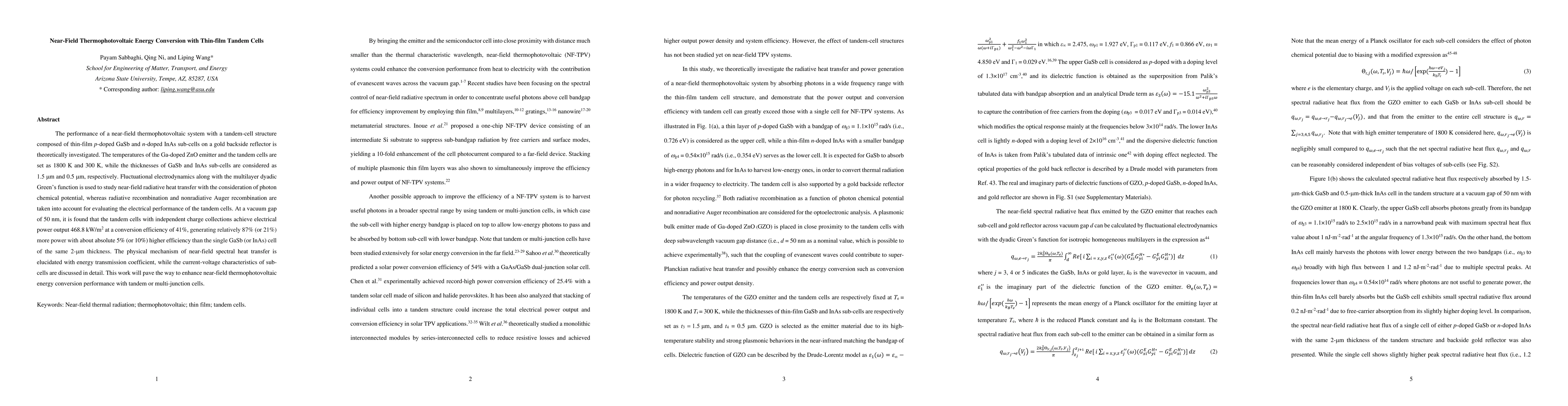 This paper investigates a near-field thermophotovoltaic system using thin-film tandem cells of p-doped GaSb and n-doped InAs, achieving a power output of 468.8 kW/m² and an efficiency of 41%. The study highlights the advantages of tandem cells over single cells in terms of power and efficiency, providing insights into near-field radiative heat transfer mechanisms.