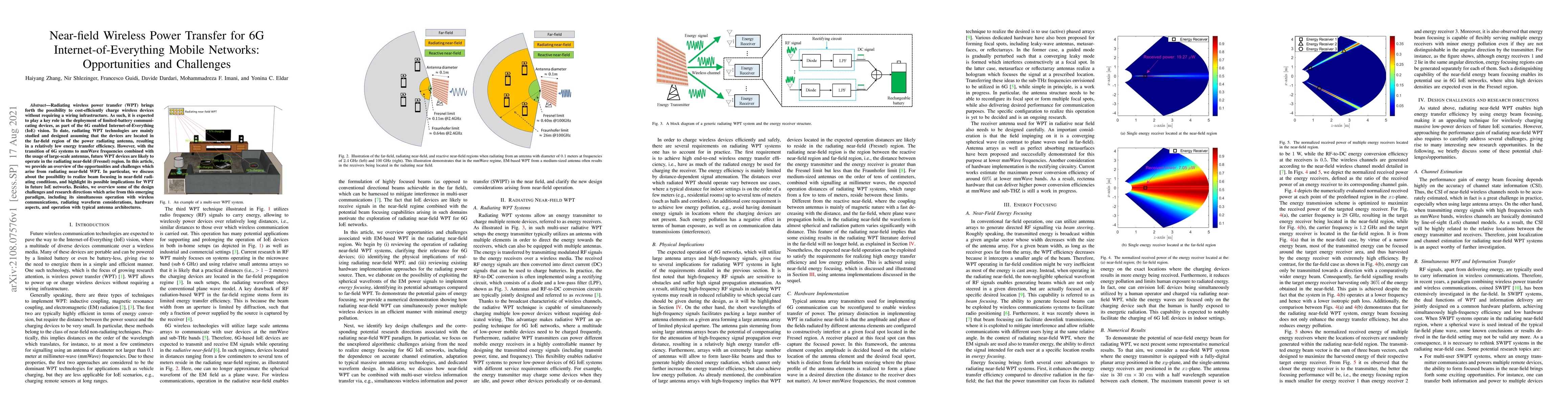 Radiating wireless power transfer (WPT) brings forth the possibility to cost-efficiently charge wireless devices without requiring a wiring infrastructure. As such, it is expected to play a key role in the deployment of limited-battery communicating devices, as part of the 6G enabled Internet-of-Everything (IoE) vision. To date, radiating WPT technologies are mainly studied and designed assuming that the devices are located in the far-field region of the power radiating antenna, resulting in a relatively low energy transfer efficiency. However, with the transition of 6G systems to mmWave frequencies combined with the usage of large-scale antennas, future WPT devices are likely to operate in the radiating near-field (Fresnel) region. In this article, we provide an overview of the opportunities and challenges which arise from radiating near-field WPT. In particular, we discuss about the possibility to realize beam focusing in near-field radiating conditions, and highlight its possible implications for WPT in future {IoE} networks. Besides, we overview some of the design challenges and research directions which arise from this emerging paradigm, including its simultaneous operation with wireless communications, radiating waveform considerations, hardware aspects, and operation with typical antenna architectures.