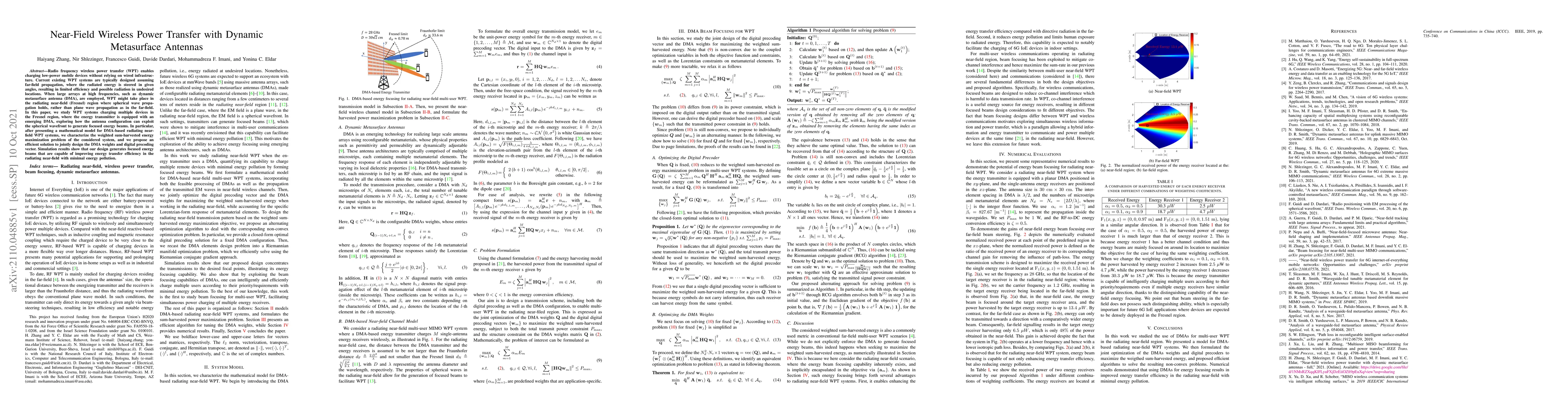 Radio frequency wireless power transfer (WPT) enables charging low-power mobile devices without relying on wired infrastructure. Current existing WPT systems are typically designed assuming far-field propagation, where the radiated energy is steered in given angles, resulting in limited efficiency and possible radiation in undesired locations. When large arrays at high frequencies, such as DMA, are employed, WPT might take place in the radiating near-field (Fresnel) region where spherical wave propagation holds, rather than plane wave propagation as in the far-field. In this paper, we study WPT systems charging multiple devices in the Fresnel region, where the energy transmitter is equipped with an emerging DMA, exploring how the antenna configuration can exploit the spherical wavefront to generate focused energy beams. In particular, after presenting a mathematical model for DMA-based radiating near-field WPT systems, we characterize the weighted sum-harvested energy maximization problem of the considered system, and we propose an efficient solution to jointly design the DMA weights and digital precoding vector. Simulation results show that our design generates focused energy beams that are capable of improving energy transfer efficiency in the radiating near-field with minimal energy pollution.