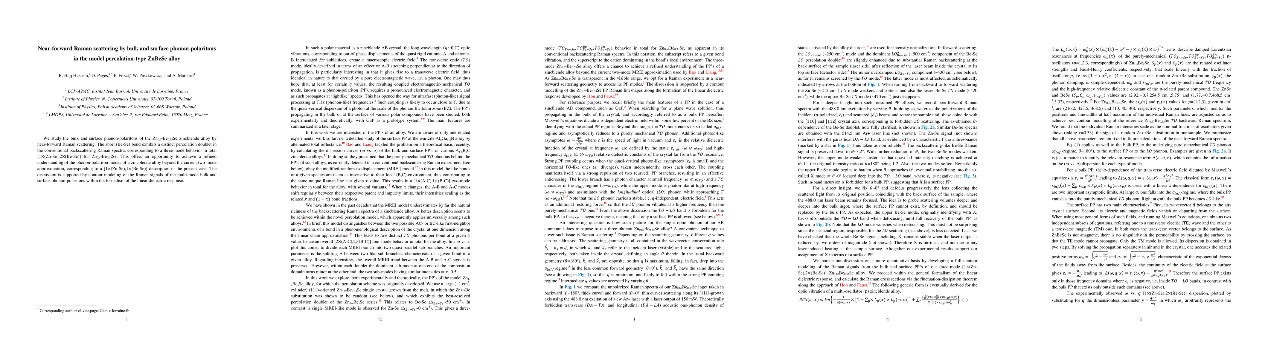 We study the bulk and surface phonon-polaritons of the Zn0.67Be0.33Se zincblende alloy by near-forward Raman scattering. The short (Be-Se) bond exhibits a distinct percolation doublet in the conventional backscattering Raman spectra, corresponding to a three-mode behavior in total [1(Zn-Se),2(Be-Se)] for Zn0.67Be0.33Se. This offers an opportunity to achieve a refined understanding of the phonon-polariton modes of a zincblende alloy beyond the current two-mode approximation, corresponding to a [1(Zn-Se),1(Be-Se)] description in the present case. The discussion is supported by contour modeling of the Raman signals of the multi-mode bulk and surface phonon-polaritons within the formalism of the linear dielectric response.