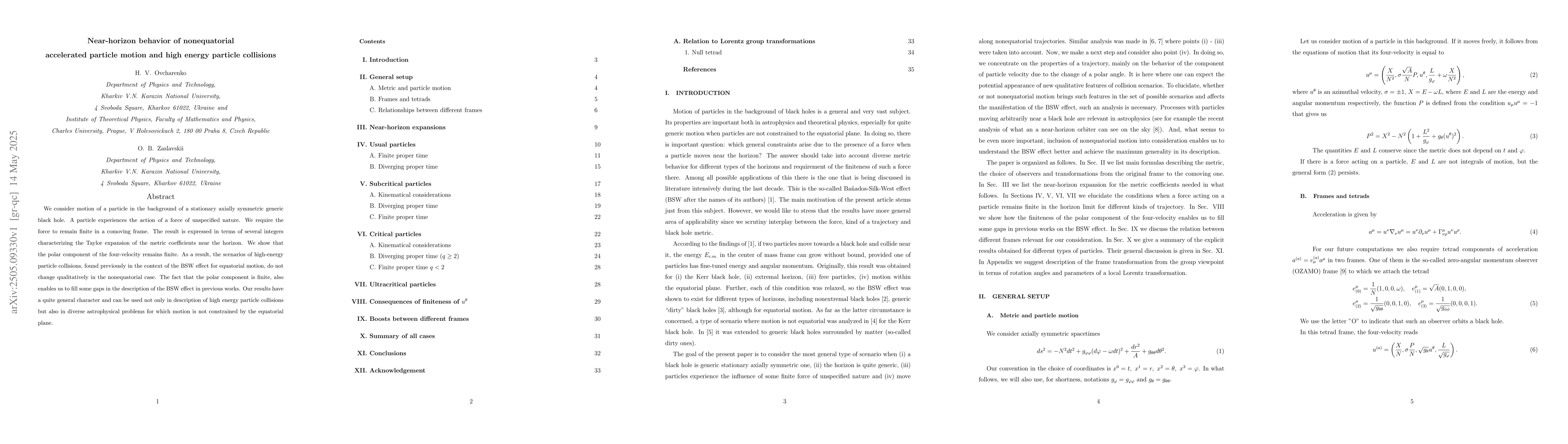 The paper presents a detailed analysis of particle motion near black hole horizons, characterizing it through Taylor expansions of metric coefficients, and demonstrates the finiteness of the polar four-velocity component in nonequatorial cases.