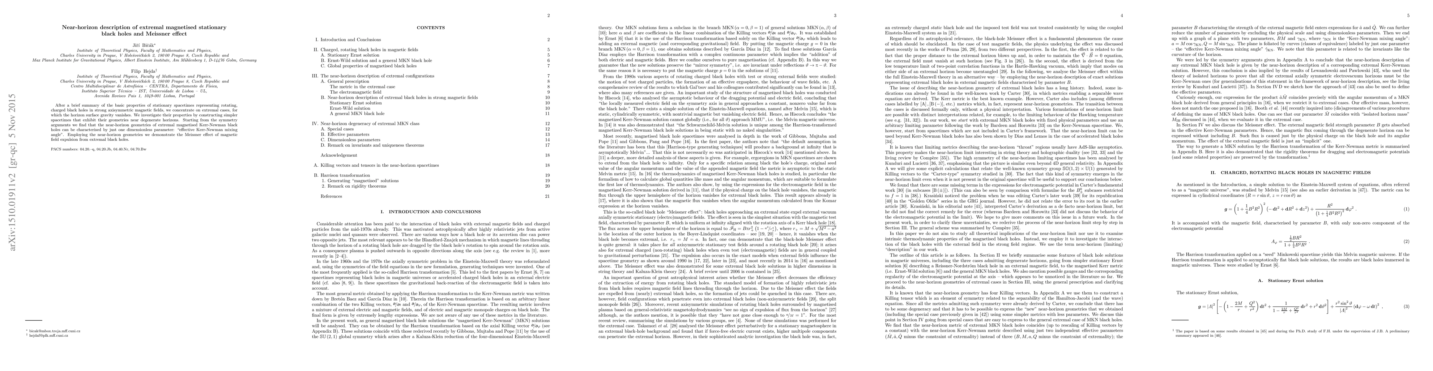 This paper examines extremal magnetised stationary black holes and demonstrates that their near-horizon geometries can be characterized by a single dimensionless parameter, the "effective Kerr-Newman mixing angle." It also shows that extremal black holes exhibit the Meissner effect, expelling magnetic fields from their vicinity.