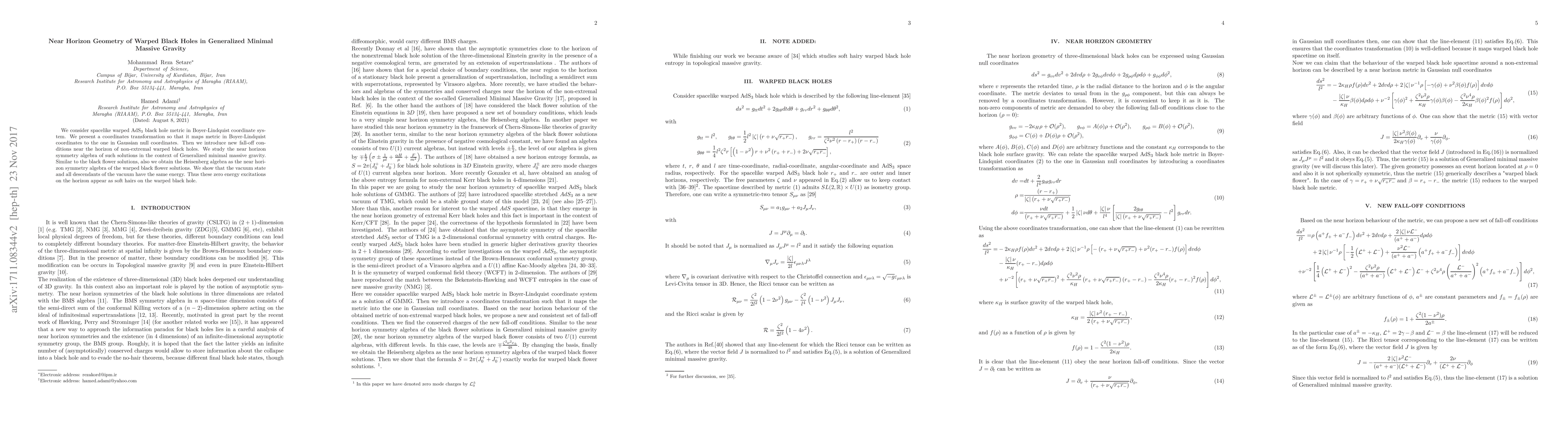 This paper studies the near-horizon geometry of warped AdS$_3$ black holes in Generalized Minimal Massive Gravity, introducing a coordinate transformation and new fall-off conditions. It finds that the near-horizon symmetry algebra is a Heisenberg algebra, similar to black flower solutions, indicating that zero energy excitations manifest as soft hairs on the warped black hole horizon.