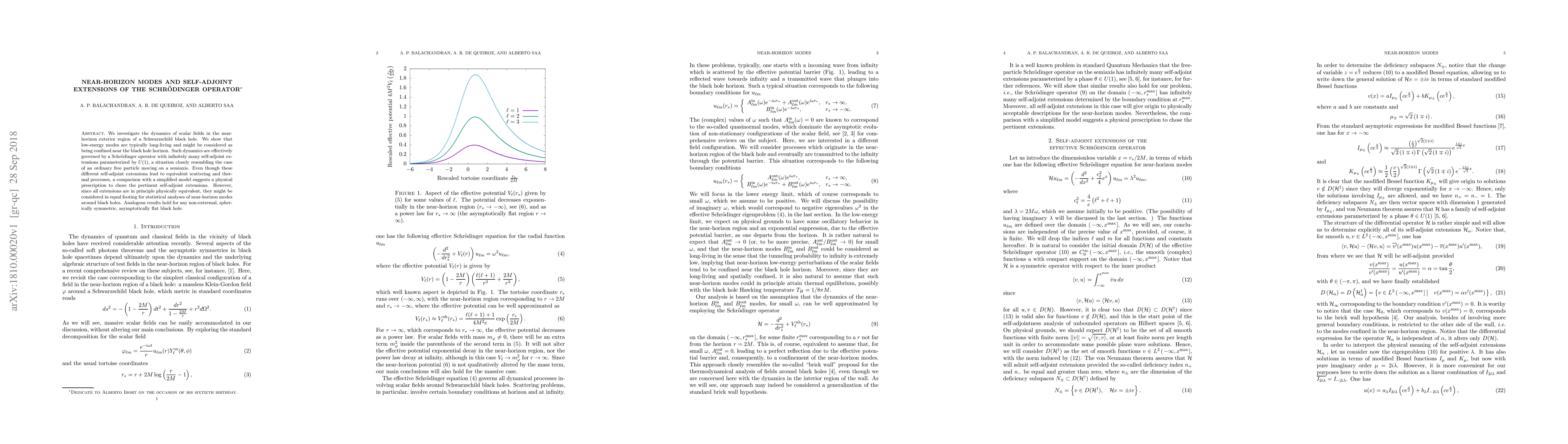 This paper explores the dynamics of scalar fields near the horizon of Schwarzschild black holes, demonstrating that low-energy modes are long-lived and governed by a Schrödinger operator with multiple self-adjoint extensions. While these extensions lead to equivalent physical processes, a simplified model suggests a method to select the appropriate extension, though all remain equally valid for statistical analyses.