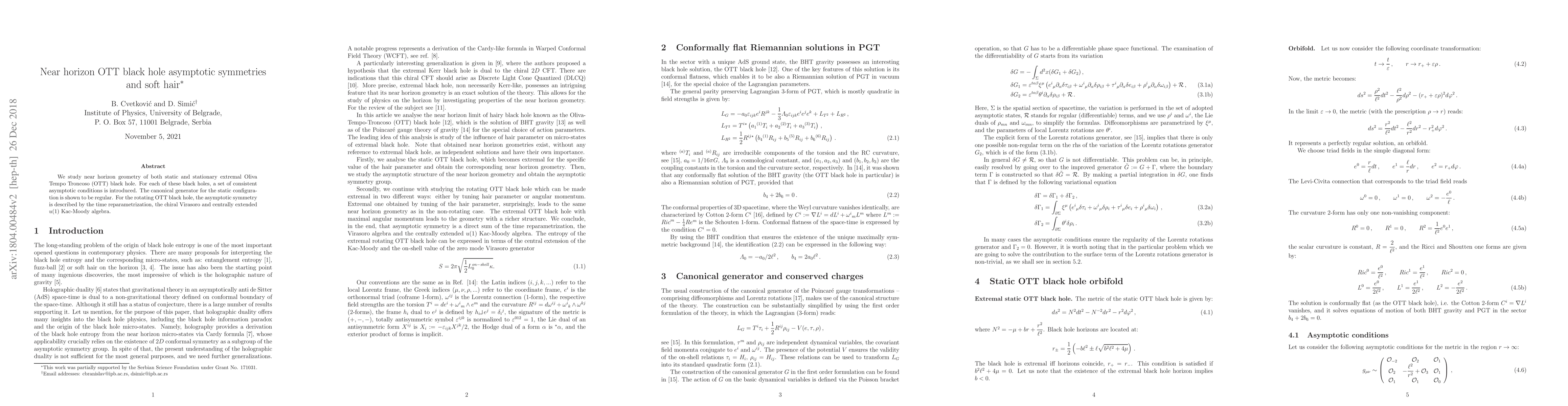 We study the near horizon geometry of both static and stationary extremal Oliva Tempo Troncoso (OTT) black holes. For each of these cases, a set of consistent asymptotic conditions is introduced. The canonical generator for the static configuration is shown to be regular. For the rotating OTT black hole, the asymptotic symmetry is described by the time reparametrization, the chiral Virasoro and centrally extended $u(1)$ Kac-Moody algebras.