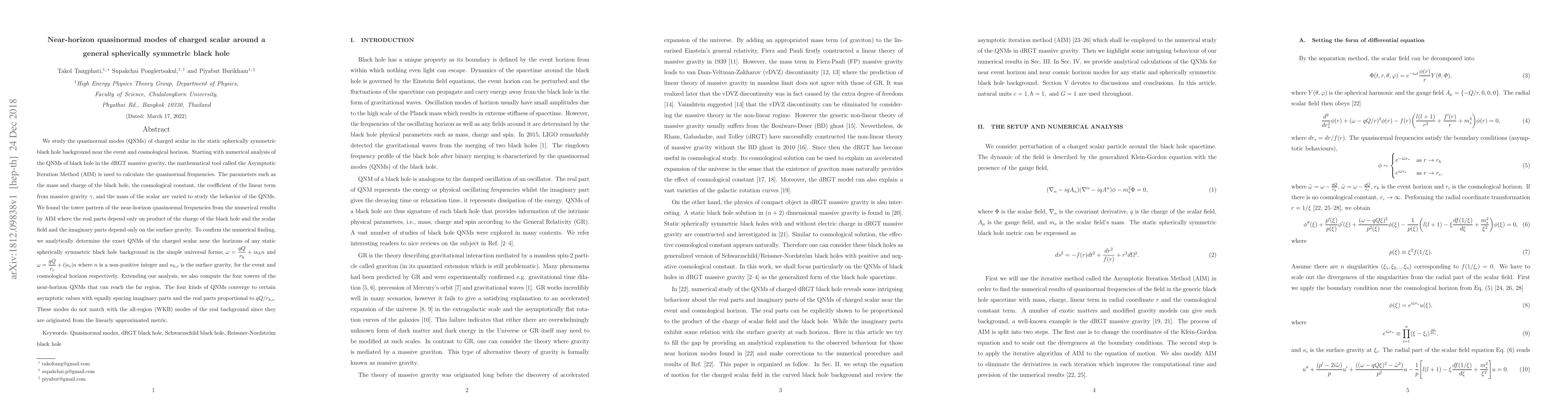 We study the quasinormal modes (QNMs) of charged scalar in the static spherically symmetric black hole background near the event and cosmological horizon. Starting with numerical analysis of the QNMs of black hole in the dRGT massive gravity, the mathematical tool called the Asymptotic Iteration Method~(AIM) is used to calculate the quasinormal frequencies. The parameters such as the mass and charge of the black hole, the cosmological constant, the coefficient of the linear term from massive gravity $\gamma$, and the mass of the scalar are varied to study the behavior of the QNMs. We found the tower pattern of the near-horizon quasinormal frequencies from the numerical results by AIM where the real parts depend only on product of the charge of the black hole and the scalar field and the imaginary parts depend only on the surface gravity. To confirm the numerical finding, we analytically determine the exact QNMs of the charged scalar near the horizons of any static spherically symmetric black hole background in the simple universal forms; $\omega = \displaystyle{\frac{qQ}{r_h}} + i \kappa_h n$ and $\omega = \displaystyle{\frac{qQ}{r_c}} + i |\kappa_c| n$ where $n$ is a non-positive integer and $\kappa_{h,c}$ is the surface gravity, for the event and cosmological horizon respectively. Extending our analysis, we also compute the four towers of the near-horizon QNMs that can reach the far region. The four kinds of QNMs converge to certain asymptotic values with equally spacing imaginary parts and the real parts proportional to $qQ/r_{h,c}$. These modes do not match with the all-region~(WKB) modes of the real background since they are originated from the linearly approximated metric.
