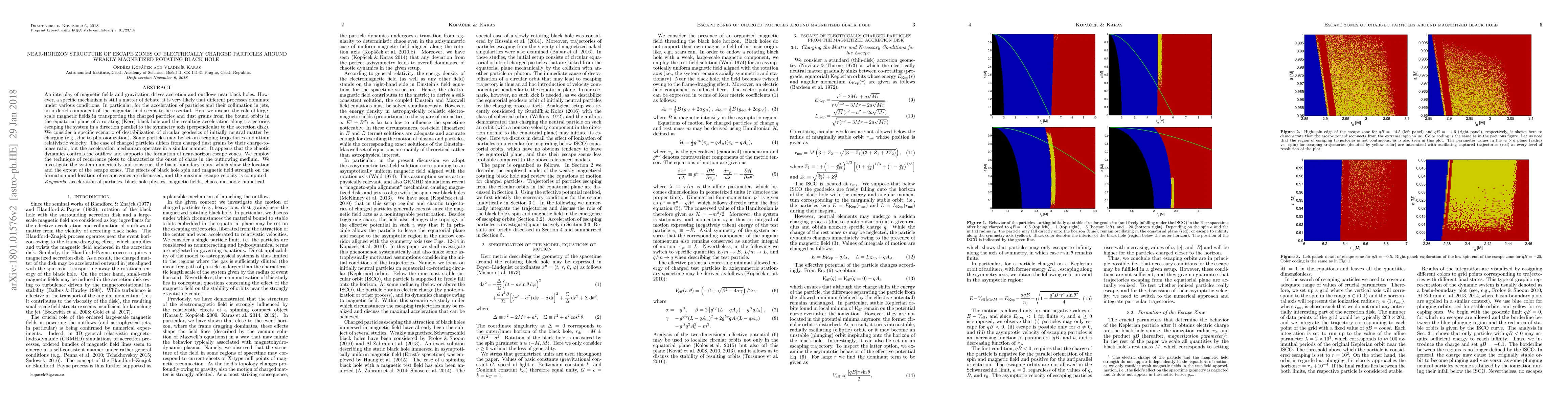 An interplay of magnetic fields and gravitation drives accretion and outflows near black holes. However, a specific mechanism is still a matter of debate; it is very likely that different processes dominate under various conditions. In particular, for the acceleration of particles and their collimation in jets, an ordered component of the magnetic field seems to be essential. Here we discuss the role of large-scale magnetic fields in transporting the charged particles and dust grains from the bound orbits in the equatorial plane of a rotating (Kerr) black hole and the resulting acceleration along trajectories escaping the system in a direction parallel to the symmetry axis (perpendicular to the accretion disk). We consider a specific scenario of destabilization of circular geodesics of initially neutral matter by charging (e.g., due to photoionization). Some particles may be set on escaping trajectories and attain relativistic velocity. The case of charged particles differs from charged dust grains by their charge-to-mass ratio, but the acceleration mechanism operates in a similar manner. It appears that the chaotic dynamics controls the outflow and supports the formation of near-horizon escape zones. We employ the technique of recurrence plots to characterize the onset of chaos in the outflowing medium. We investigate the system numerically and construct the basin-boundary plots, which show the location and the extent of the escape zones. The effects of black hole spin and magnetic field strength on the formation and location of escape zones are discussed, and the maximal escape velocity is computed.