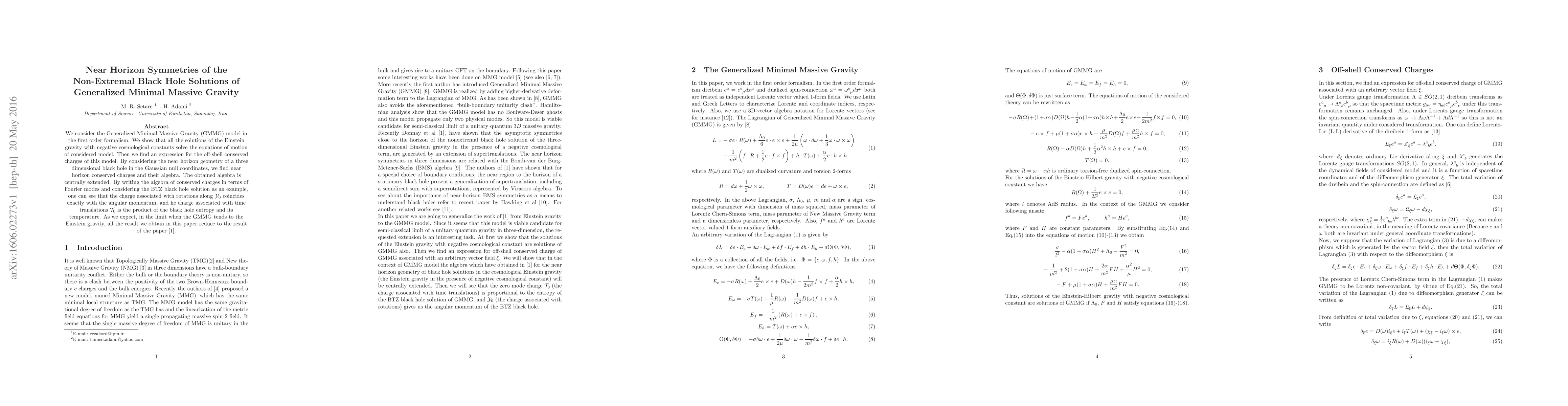 We consider the Generalized Minimal Massive Gravity (GMMG) model in the first order formalism. We show that all the solutions of the Einstein gravity with negative cosmological constants solve the equations of motion of considered model. Then we find an expression for the off-shell conserved charges of this model. By considering the near horizon geometry of a three dimensional black hole in the Gaussian null coordinates, we find near horizon conserved charges and their algebra. The obtained algebra is centrally extended. By writing the algebra of conserved charges in terms of Fourier modes and considering the BTZ black hole solution as an example, one can see that the charge associated with rotations along $\mathcal{Y}_{0}$ coincides exactly with the angular momentum, and he charge associated with time translations $\mathcal{T}_{0}$ is the product of the black hole entropy and its temperature. As we expect, in the limit when the GMMG tends to the Einstein gravity, all the result we obtain in this paper reduce to the result of the paper \cite{5}.