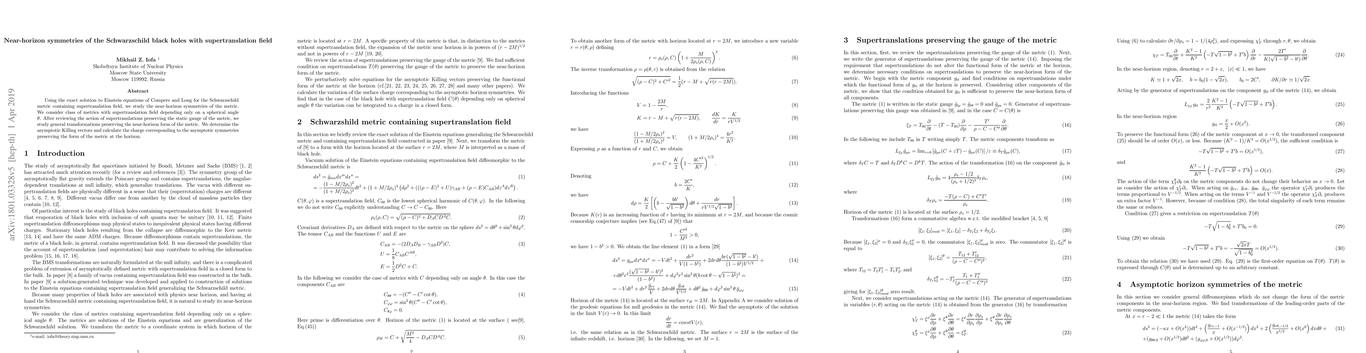 Using the exact solution to Einstein equations of Compere and Long for the Schwarzschild metric containing supertranslation field, we study the near-horizon symmetries of the metric. We consider class of metrics with supertranslation field depending only on a spherical angle $\theta $. After reviewing the action of supertranslations preserving the static gauge of the metric, we study general transformations preserving the near-horizon form of the metric. We determine the asymptotic Killing vectors and calculate the charge corresponding to the asymptotic symmetries preserving the form of the metric at the horizon.