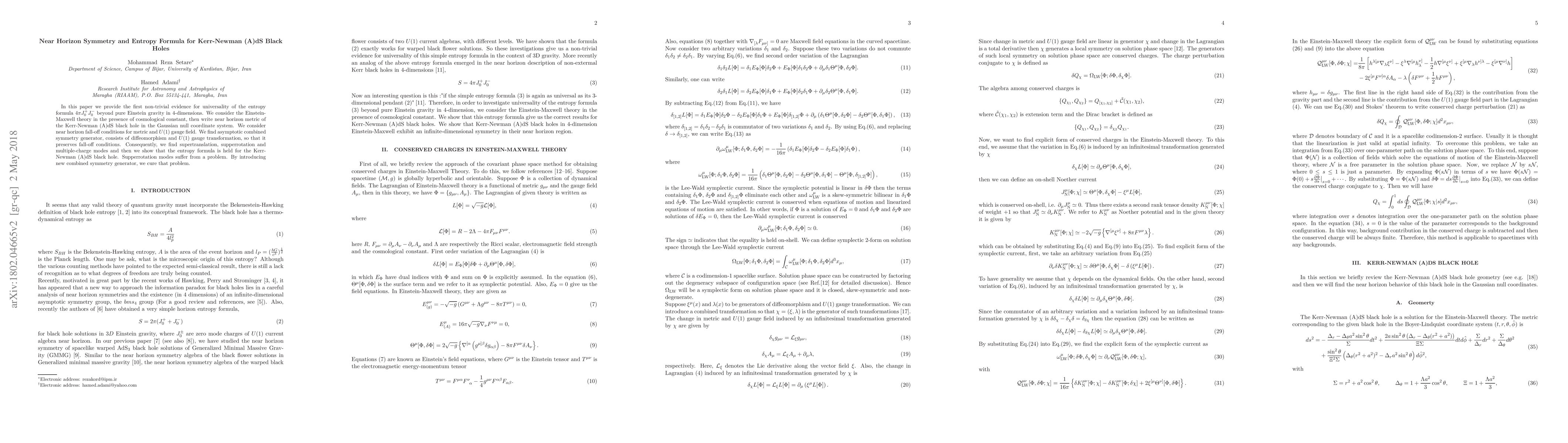 In this paper we provide the first non-trivial evidence for universality of the entropy formula $4\pi J_{0}^{+}J_{0}^{-}$ beyond pure Einstein gravity in 4-dimensions. We consider the Einstein-Maxwell theory in the presence of cosmological constant, then write near horizon metric of the Kerr-Newman (A)dS black hole in the Gaussian null coordinate system. We consider near horizon fall-off conditions for metric and $U(1)$ gauge field. We find asymptotic combined symmetry generator, consists of diffeomorphism and $U(1)$ gauge transformation, so that it preserves fall-off conditions. Consequently, we find supertranslation, supperrotation and multiple-charge modes and then we show that the entropy formula is held for the Kerr-Newman (A)dS black hole. Supperrotation modes suffer from a problem. By introducing new combined symmetry generator, we cure that problem.