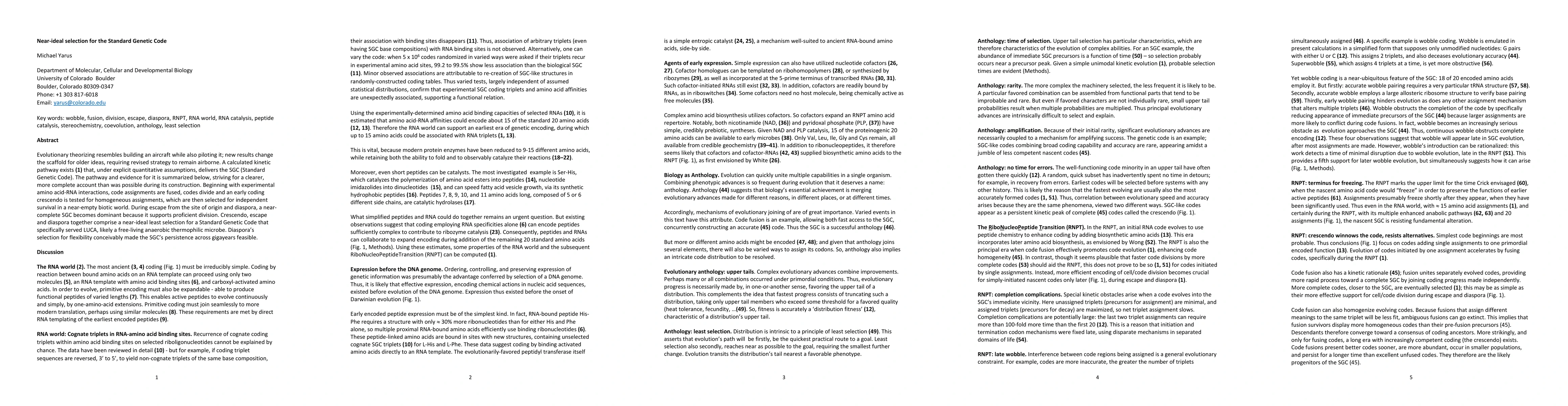 Evolutionary theorizing resembles building an aircraft while also piloting it; new results change the scaffold for older ideas, requiring revised strategy to remain airborne. A calculated kinetic pathway exists that, under explicit quantitative assumptions, delivers the SGC (Standard Genetic Code). The pathway and evidence for it is summarized below, striving for a clearer, more complete account than was possible during its construction. Beginning with experimental amino acid-RNA interactions, code assignments are fused, codes divide and an early coding crescendo is tested for homogeneous assignments, which are then selected for independent survival in a near-empty biotic world. During escape from the site of origin and diaspora, a near-complete SGC becomes dominant by supporting proficient division. Crescendo, escape and diaspora together comprise a near-ideal least selection for a Standard Genetic Code that specifically served LUCA, likely a free-living anaerobic thermophilic microbe. Selection during diaspora conceivably made persistence across gigayears feasible.