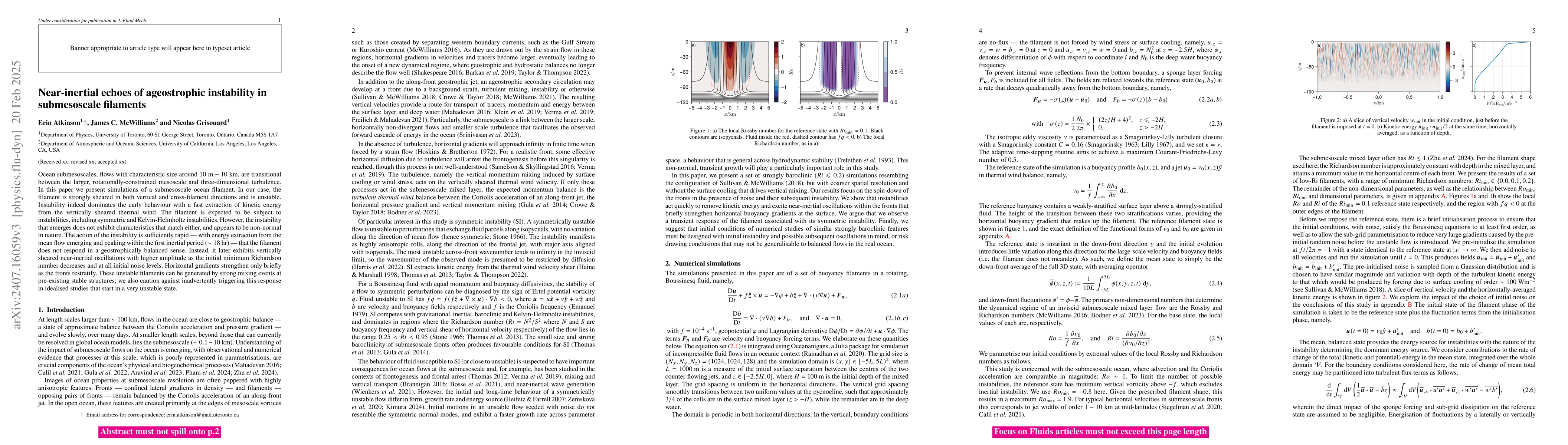 This study simulates a submesoscale ocean filament, revealing its instability and rapid kinetic energy extraction through ageostrophic processes. The filament later displays vertically sheared near-inertial oscillations, emphasizing the need for careful consideration of these dynamics in numerical models of submesoscale flows.