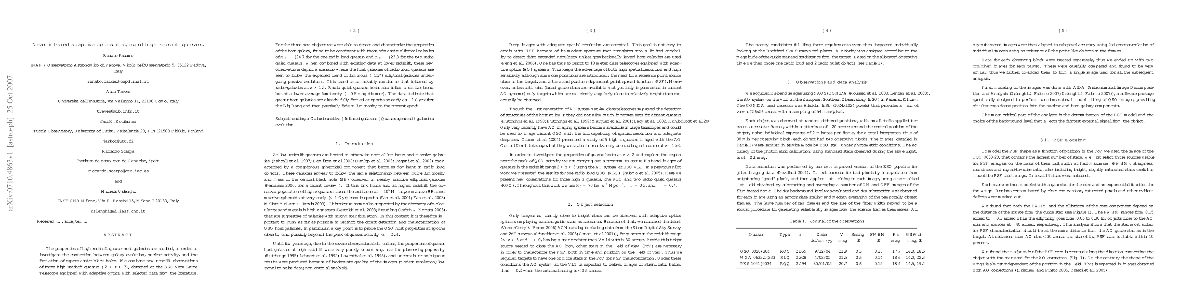 This study uses near-infrared adaptive optics imaging to investigate high redshift quasar host galaxies, finding they resemble massive elliptical galaxies. The results suggest that radio loud quasars follow the trend of luminous elliptical galaxies undergoing passive evolution, while radio quiet quasars do so at a lower luminosity, indicating both types of quasars' host galaxies were already formed early in the universe's history.