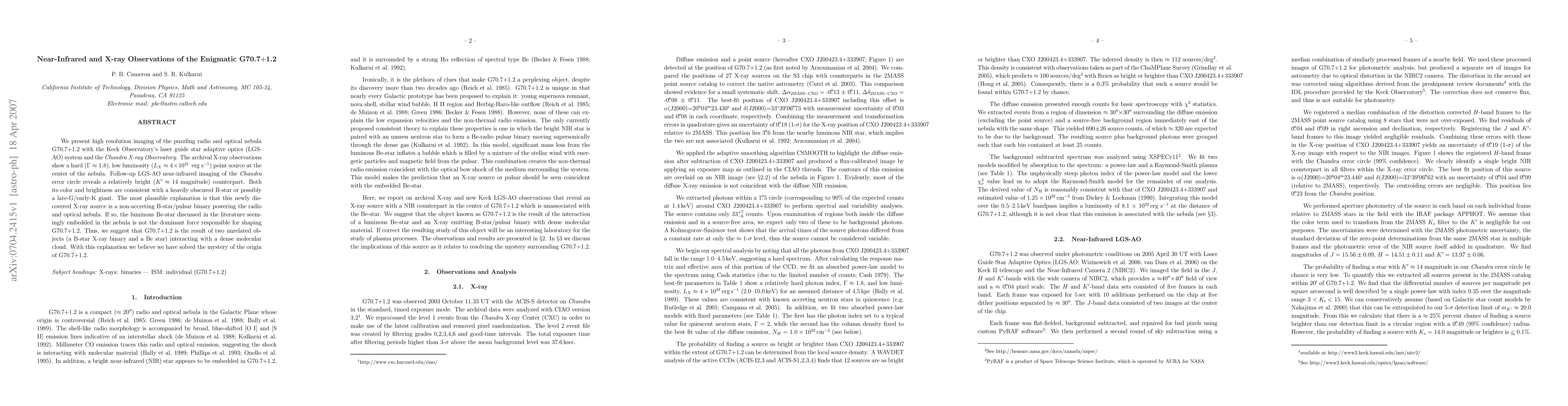 We present high resolution imaging of the puzzling radio and optical nebula G70.7+1.2 with the Keck Observatory's laser guide star adaptive optics (LGS-AO) system and the Chandra X-ray Observatory. The archival X-ray observations show a hard (Gamma ~ 1.8), low luminosity (L_X ~ 4 x 10^31 ergs/s) point source at the center of the nebula. Follow-up LGS-AO near-infrared imaging of the Chandra error circle reveals a relatively bright (K' ~ 14 magnitude) counterpart. Both its color and brightness are consistent with a heavily obscured B-star or possibly a late-G/early-K giant. The most plausible explanation is that this newly discovered X-ray source is a non-accreting B-star/pulsar binary powering the radio and optical nebula. If so, the luminous Be-star discussed in the literature seemingly embedded in the nebula is not the dominant force responsible for shaping G70.7+1.2. Thus, we suggest that G70.7+1.2 is the result of two unrelated objects (a B-star X-ray binary and a Be star) interacting with a dense molecular cloud. With this explanation we believe we have solved the mystery of the origin of G70.7+1.2.
