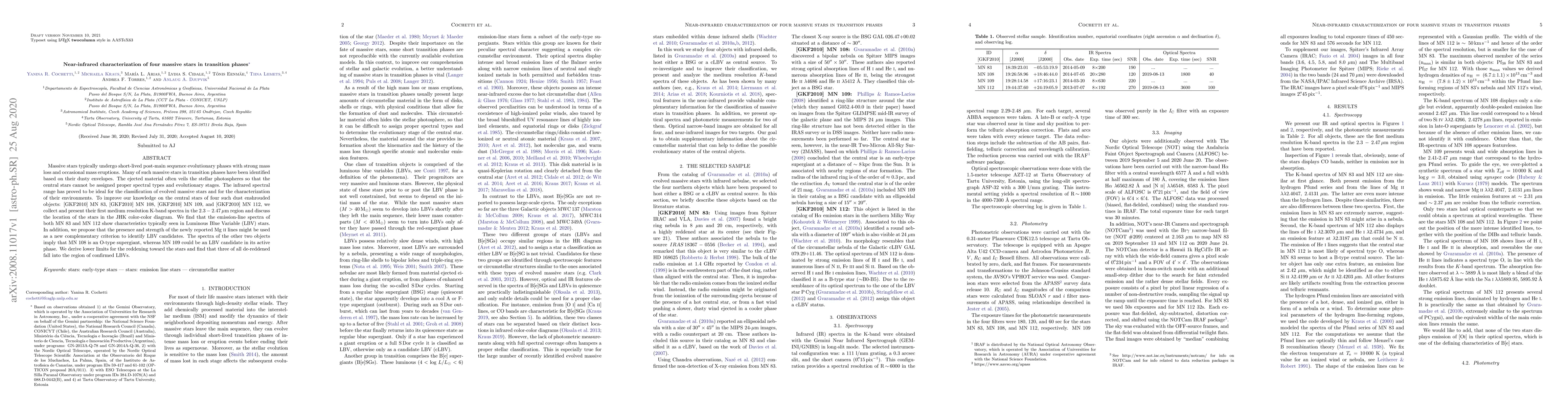 This study presents K-band spectra of four massive stars in transition phases, obscured by dust. Utilizing infrared spectral analysis, the researchers identified [GKF2010] MN 83 and MN 112 as Luminous Blue Variable (LBV) stars, proposing Mg II lines as a new identification criterion for LBV candidates. MN 108 was classified as an O-type supergiant, and MN 109 as a potential active LBV. Three of the de-reddened stars align with confirmed LBVs in the color-color diagram.