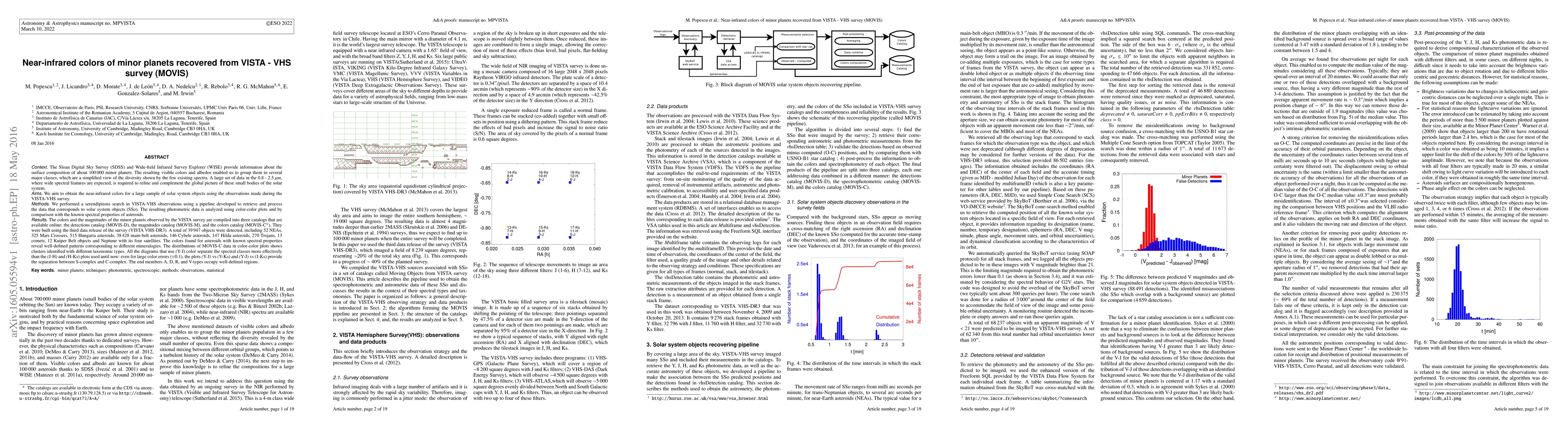 The Sloan Digital Sky Survey (SDSS) and Wide-field Infrared Survey Explorer (WISE) provide information about the surface composition of about 100,000 minor planets. The resulting visible colors and albedos enabled us to group them in several major classes, which are a simplified view of the diversity shown by the few existing spectra. We performed a serendipitous search in VISTA-VHS observations using a pipeline developed to retrieve and process the data that corresponds to solar system objects (SSo). The colors and the magnitudes of the minor planets observed by the VISTA survey are compiled into three catalogs that are available online: the detections catalog (MOVIS-D), the magnitudes catalog (MOVIS-M), and the colors catalog (MOVIS-C). They were built using the third data release of the survey (VISTA VHS-DR3). A total of 39,947 objects were detected, including 52 NEAs, 325 Mars Crossers, 515 Hungaria asteroids, 38,428 main-belt asteroids, 146 Cybele asteroids, 147 Hilda asteroids, 270 Trojans, 13 comets, 12 Kuiper Belt objects and Neptune with its four satellites. The colors found for asteroids with known spectral properties reveal well-defined patterns corresponding to different mineralogies. The distributions of MOVIS-C data in color-color plots shows clusters identified with different taxonomic types. All the diagrams that use (Y-J) color separate the spectral classes more effectively than the (J-H) and (H-Ks) plots used until now: even for large color errors (<0.1), the plots (Y-J) vs (Y-Ks) and (Y-J) vs (J-Ks) provide the separation between S-complex and C-complex. The end members A, D, R, and V-types occupy well-defined regions.