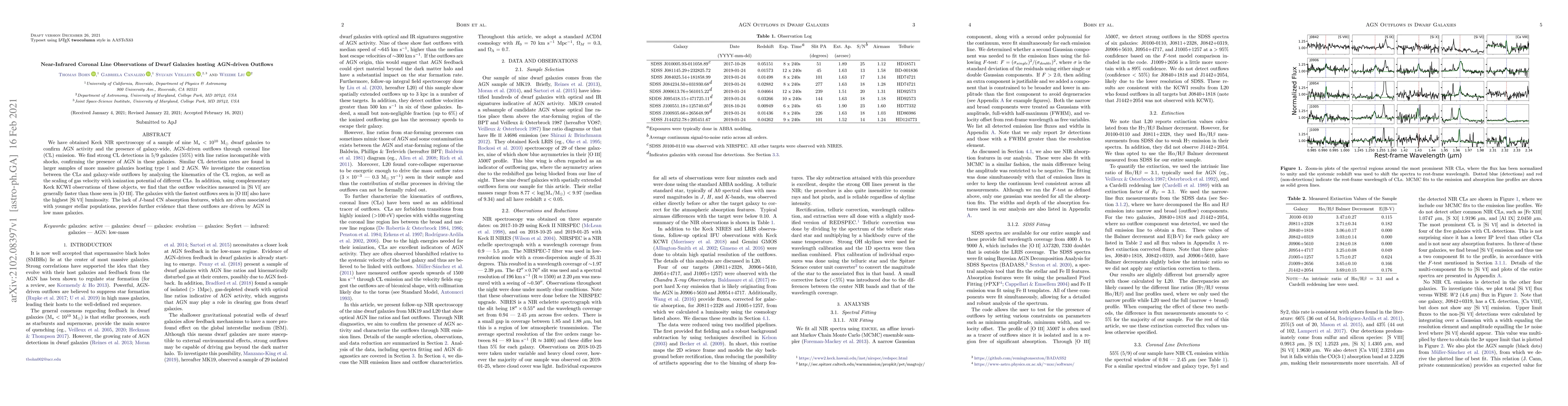We have obtained Keck NIR spectroscopy of a sample of nine M$_\star$ $<$ 10$^{10}$ M$_\odot$ dwarf galaxies to confirm AGN activity and the presence of galaxy-wide, AGN-driven outflows through coronal line (CL) emission. We find strong CL detections in 5/9 galaxies (55$\%$) with line ratios incompatible with shocks, confirming the presence of AGN in these galaxies. Similar CL detection rates are found in larger samples of more massive galaxies hosting type 1 and 2 AGN. We investigate the connection between the CLs and galaxy-wide outflows by analyzing the kinematics of the CL region, as well as the scaling of gas velocity with ionization potential of different CLs. In addition, using complementary Keck KCWI observations of these objects, we find that the outflow velocities measured in [Si VI] are generally faster than those seen in [O III]. The galaxies with the fastest outflows seen in [O III] also have the highest [Si VI] luminosity. The lack of $J$-band CN absorption features, which are often associated with younger stellar populations, provides further evidence that these outflows are driven by AGN in low mass galaxies.