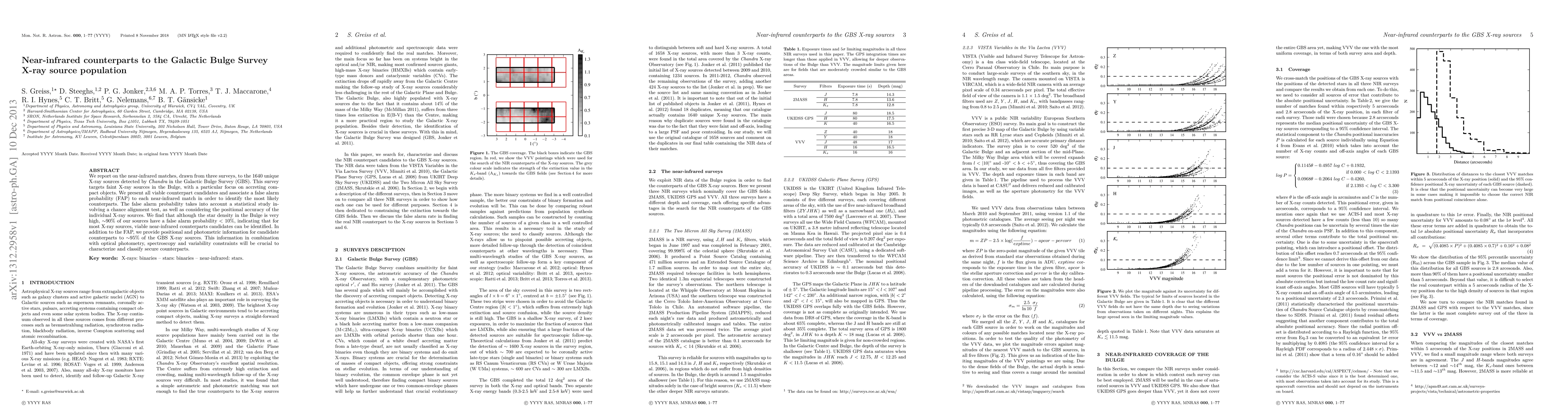 This paper identifies near-infrared counterparts to 1640 X-ray sources from the Galactic Bulge Survey using three surveys, associating each with a false alarm probability. Despite high star density, ~90% of sources have a false alarm probability < 10%, indicating reliable near-infrared counterparts can be found for most X-ray sources.
