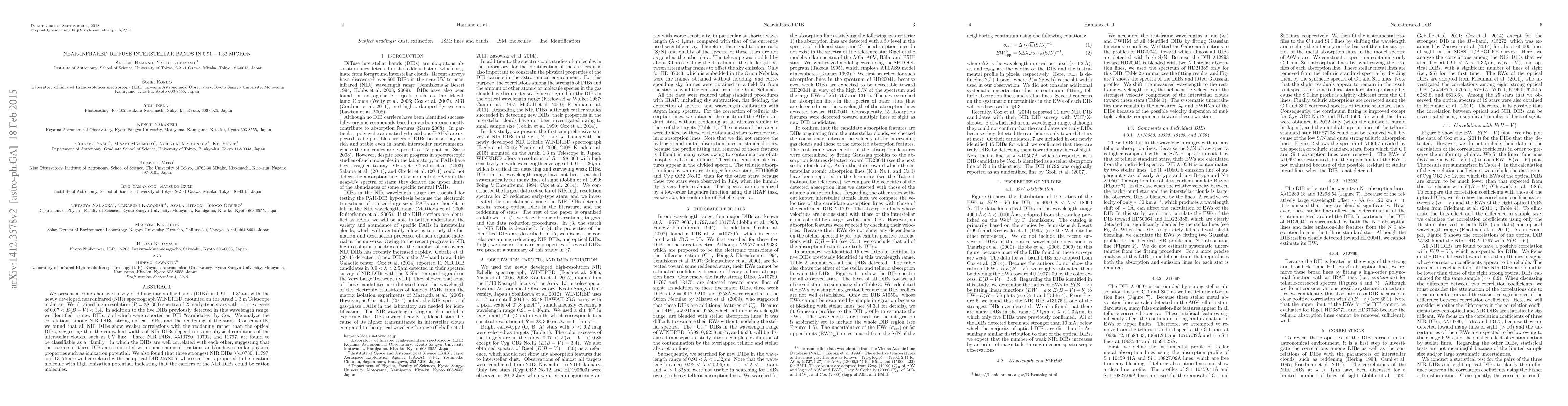 This paper reports a survey of near-infrared diffuse interstellar bands (DIBs) using the WINERED spectrograph, identifying 15 new DIBs and analyzing their correlations with optical DIBs and star reddening. The study suggests that NIR DIBs depend on interstellar cloud conditions rather than reddening, indicating potential chemical or physical properties shared by certain DIB carriers.