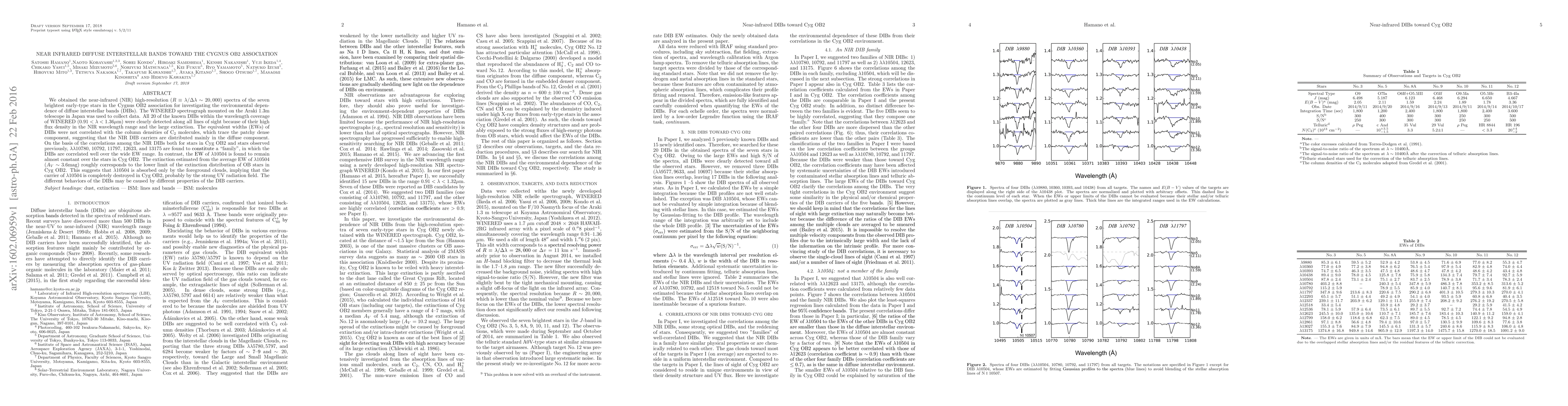 This study investigates the near-infrared diffuse interstellar bands (DIBs) toward the Cygnus OB2 association using high-resolution spectra. The findings suggest that NIR DIBs are mainly in the diffuse interstellar medium and that certain DIBs, like those at 10780, 10792, 11797, 12623, and 13175 nm, form a correlated "family," while the DIB at 10504 nm remains constant, indicating its carrier is destroyed by the strong UV radiation field in Cygnus OB2.