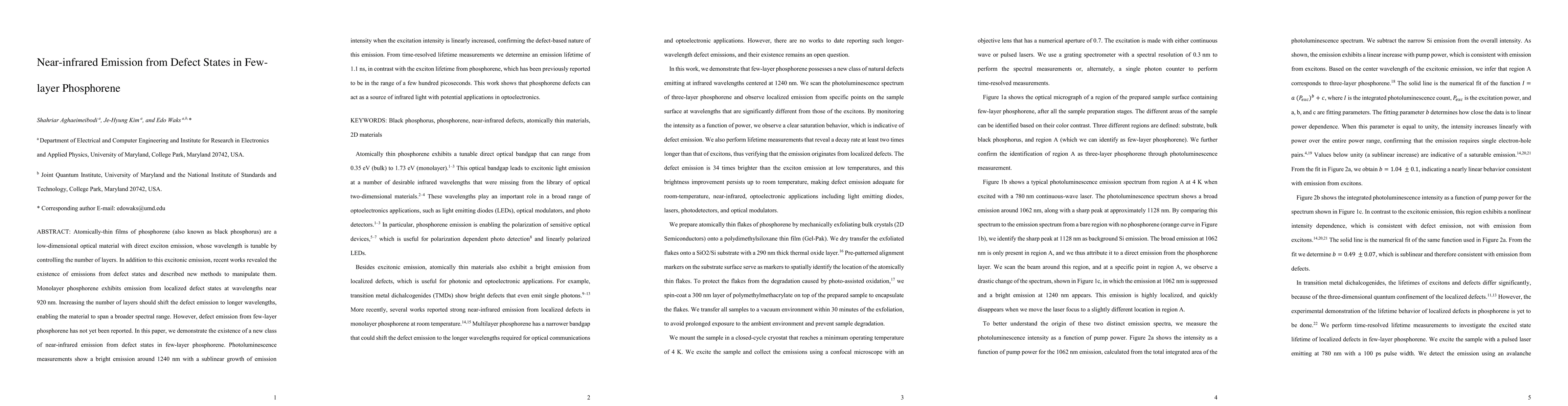 This paper demonstrates near-infrared emission from defect states in few-layer phosphorene, with photoluminescence measurements revealing bright emission around 1240 nm and a defect-based emission lifetime of 1.1 ns, contrasting with the exciton emission, highlighting potential optoelectronic applications.