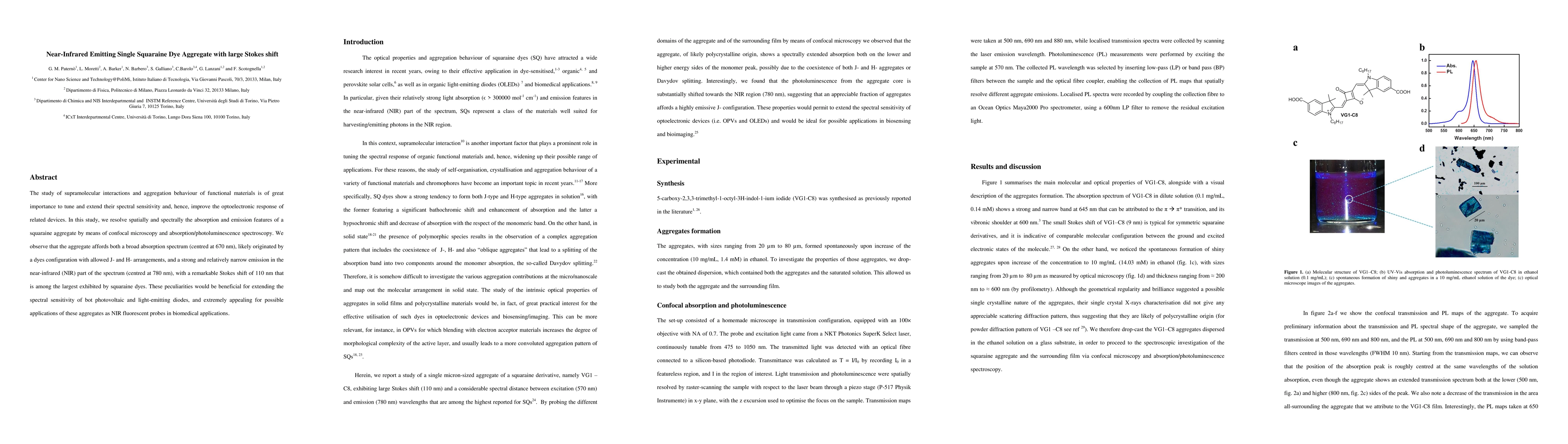 This study investigates the supramolecular aggregation of a squaraine dye, revealing a large Stokes shift and strong near-infrared emission, which could enhance the optoelectronic performance of photovoltaic devices and enable advanced biomedical imaging applications.