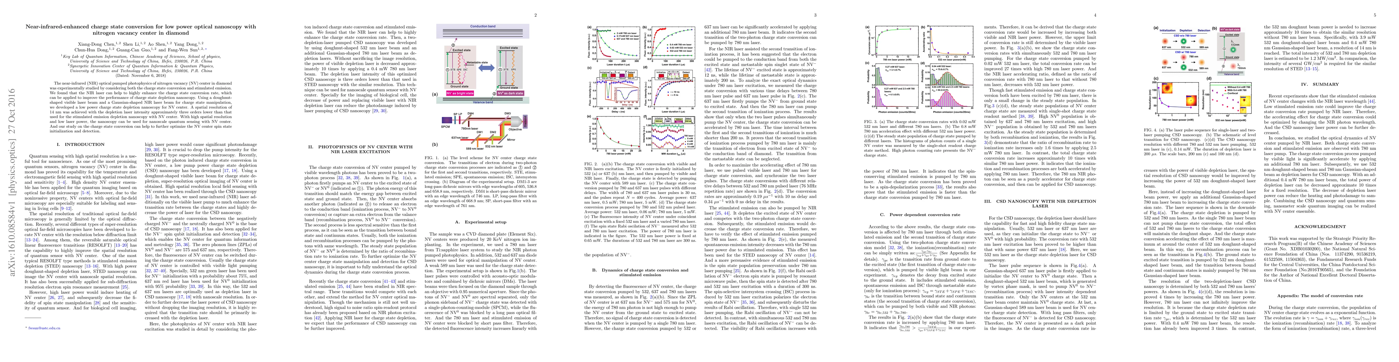 This research explores the near-infrared optical pumped photophysics of nitrogen vacancy centers in diamond, demonstrating that NIR lasers significantly enhance charge state conversion rates. The study developed low power optical nanoscopy using NIR and visible laser beams, achieving a spatial resolution of 14 nm with significantly reduced laser power, enabling nanoscale quantum sensing applications.
