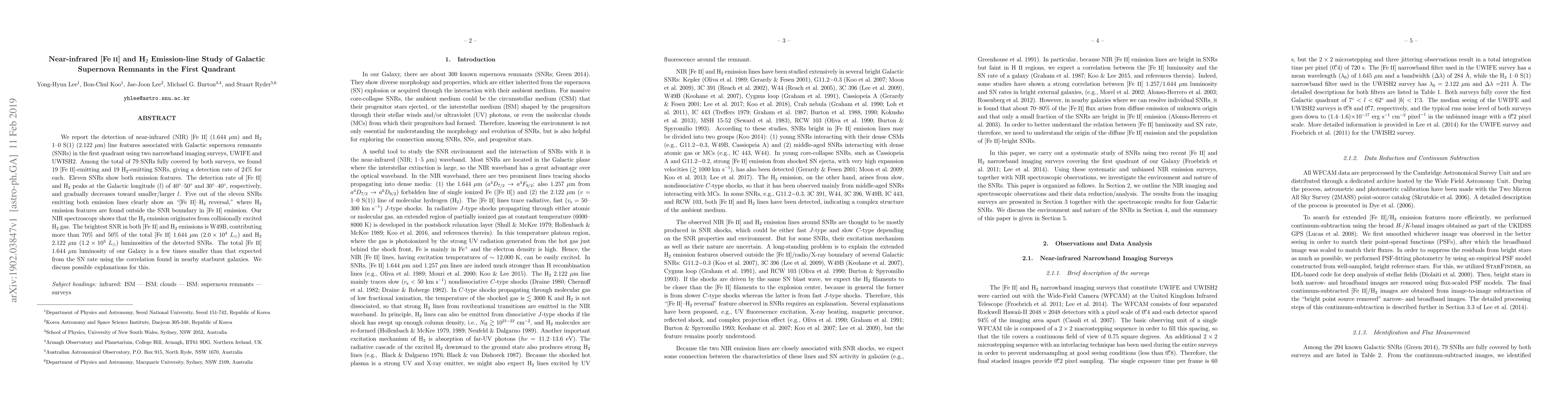 This study detects near-infrared [Fe II] and H$_2$ emission lines in 24% of Galactic supernova remnants (SNRs) in the first quadrant, with the brightest SNR being W49B. The H$_2$ emission is attributed to collisionally excited gas, and an "[Fe II]-H$_2$ reversal" is observed in some SNRs, indicating complex physical processes.