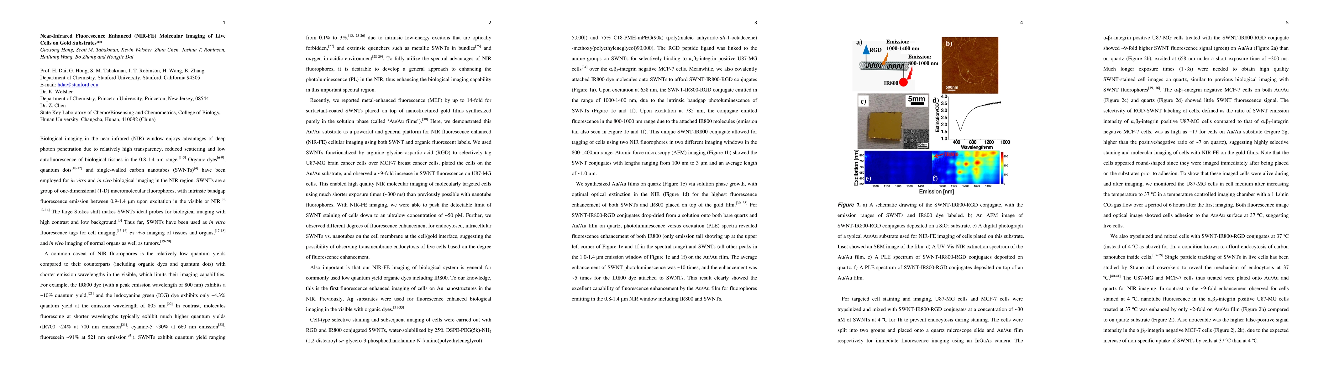 This paper reports a novel near-infrared fluorescence enhancement (NIR-FE) technique using nanostructured gold substrates to significantly improve imaging of live cells, achieving ultralow detection limits for single-walled carbon nanotubes (SWNTs) and demonstrating potential for tracking transmembrane behavior of NIR fluorophores.