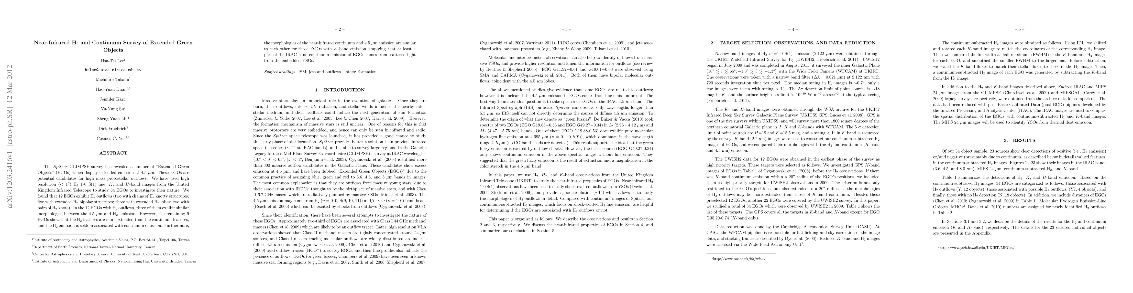 The Spitzer GLIMPSE survey has revealed a number of "Extended Green Objects" (EGOs) which display extended emission at 4.5 micron. These EGOs are potential candidates for high mass protostellar outflows. We have used high resolution (< 1") H2 1-0 S(1) line, K, and H-band images from the United Kingdom Infrared Telescope to study 34 EGOs to investigate their nature. We found that 12 EGOs exhibit H2 outflows (two with chains of H2 knotty structures; five with extended H2 bipolar structures; three with extended H2 lobes; two with pairs of H2 knots). In the 12 EGOs with H2 outflows, three of them exhibit similar morphologies between the 4.5 micron and H2 emission. However, the remaining 9 EGOs show that the H2 features are more extended than the continuum features, and the H2 emission is seldom associated with continuum emission. Furthermore, the morphologies of the near-infrared continuum and 4.5 micron emission are similar to each other for those EGOs with K-band emission, implying that at least a part of the IRAC-band continuum emission of EGOs comes from scattered light from the embedded YSOs.