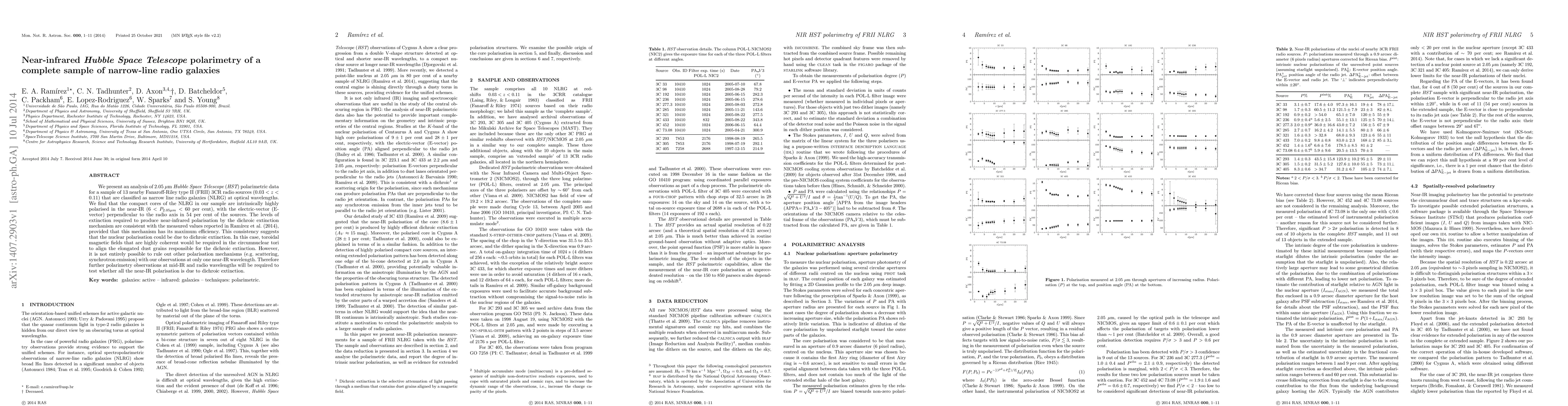This study analyzes near-infrared Hubble Space Telescope polarimetry data for a sample of 13 nearby narrow-line radio galaxies, finding that their cores are highly polarized, suggesting dichroic extinction by aligned dust grains. Further mid-IR and radio observations are needed to confirm if all near-IR polarization results from this mechanism.