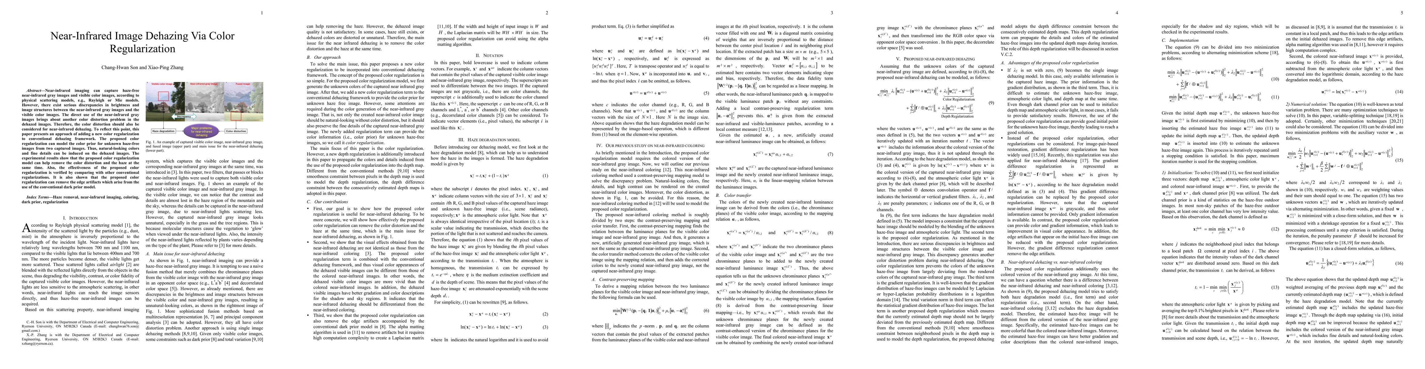 Near-infrared imaging can capture haze-free near-infrared gray images and visible color images, according to physical scattering models, e.g., Rayleigh or Mie models. However, there exist serious discrepancies in brightness and image structures between the near-infrared gray images and the visible color images. The direct use of the near-infrared gray images brings about another color distortion problem in the dehazed images. Therefore, the color distortion should also be considered for near-infrared dehazing. To reflect this point, this paper presents an approach of adding a new color regularization to conventional dehazing framework. The proposed color regularization can model the color prior for unknown haze-free images from two captured images. Thus, natural-looking colors and fine details can be induced on the dehazed images. The experimental results show that the proposed color regularization model can help remove the color distortion and the haze at the same time. Also, the effectiveness of the proposed color regularization is verified by comparing with other conventional regularizations. It is also shown that the proposed color regularization can remove the edge artifacts which arise from the use of the conventional dark prior model.