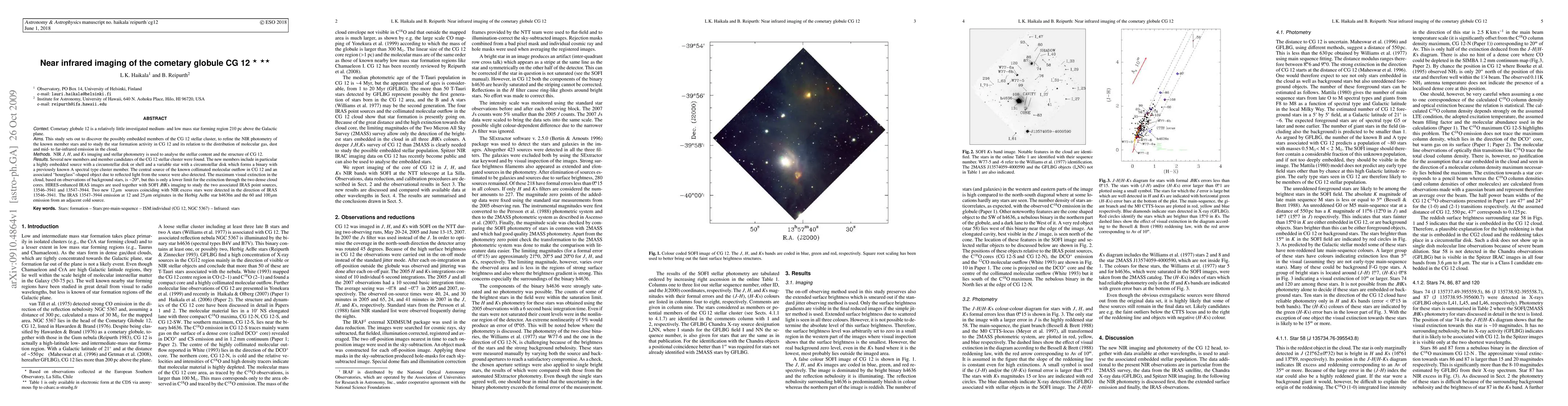 Cometary globule 12 is a relatively little investigated medium- and low mass star forming region 210 pc above the Galactic plane. NIR J, H, and Ks imaging and stellar photometry is used to analyse the stellar content and the structure of CG 12. Several new members and member candidates of the CG 12 stellar cluster were found. The new members include in particular a highly embedded source with a circumstellar disk or shell and a variable star with a circumstellar disk which forms a binary with a previously known A spectral type cluster member. The central source of the known collimated molecular outflow in CG 12 and an associated "hourglass"-shaped object due to reflected light from the source were also detected. HIRES-enhanced IRAS images are used together with SOFI J,H,Ks imaging to study the two associated IRAS point sources, 13546-3941 and 13547-3944. Two new 12 micrometer sources coinciding with NIR excess stars were detected in the direction of IRAS 13546-3941. The IRAS 13547-3944 emission at 12 and 25 micrometers originates in the Herbig AeBe star h4636n and the 60 and 100 micrometer emission from an adjacent cold source.