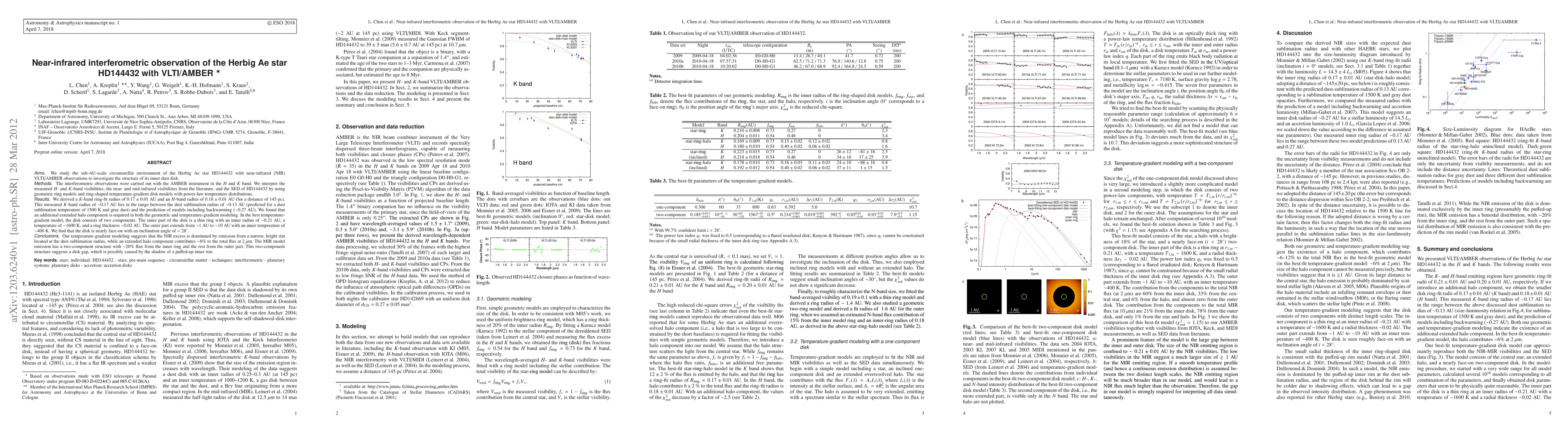 We study the sub-AU-scale circumstellar environment of the Herbig Ae star HD144432 with near-infrared (NIR) VLTI/AMBER observations to investigate the structure of its inner dust disk. The interferometric observations were carried out with the AMBER instrument in the H and K band. We interpret the measured H- and K-band visibilities, the near- and mid-infrared visibilities from the literature, and the SED of HD144432 by using geometric ring models and ring-shaped temperature-gradient disk models with power-law temperature distributions. We derived a K-band ring-fit radius of 0.17 \pm 0.01 AU and an H-band radius of 0.18 \pm 0.01 AU (for a distance of 145 pc). This measured K-band radius of \sim0.17 AU lies in the range between the dust sublimation radius of \sim0.13 AU (predicted for a dust sublimation temperature of 1500 K and gray dust) and the prediction of models including backwarming (\sim0.27 AU). We found that an additional extended halo component is required in both the geometric and temperature-gradient modeling. In the best temperature- gradient model, the disk consists of two components. The inner part of the disk is a thin ring with an inner radius of \sim0.21 AU, a temperature of \sim1600 K, and a ring thickness \sim0.02 AU. The outer part extends from \sim1 AU to \sim10 AU with an inner temperature of \sim400 K. We find that the disk is nearly face-on with an inclination angle of < 28 degree. Our temperature-gradient modeling suggests that the NIR excess is dominated by emission from a narrow, bright rim located at the dust sublimation radius, while an extended halo component contributes \sim6% to the total flux at 2 {\mu}m. The MIR model emission has a two-component structure with \sim20% flux from the inner ring and the rest from the outer part. This two-component structure suggests a disk gap, which is possibly caused by the shadow of a puffed-up inner rim.
