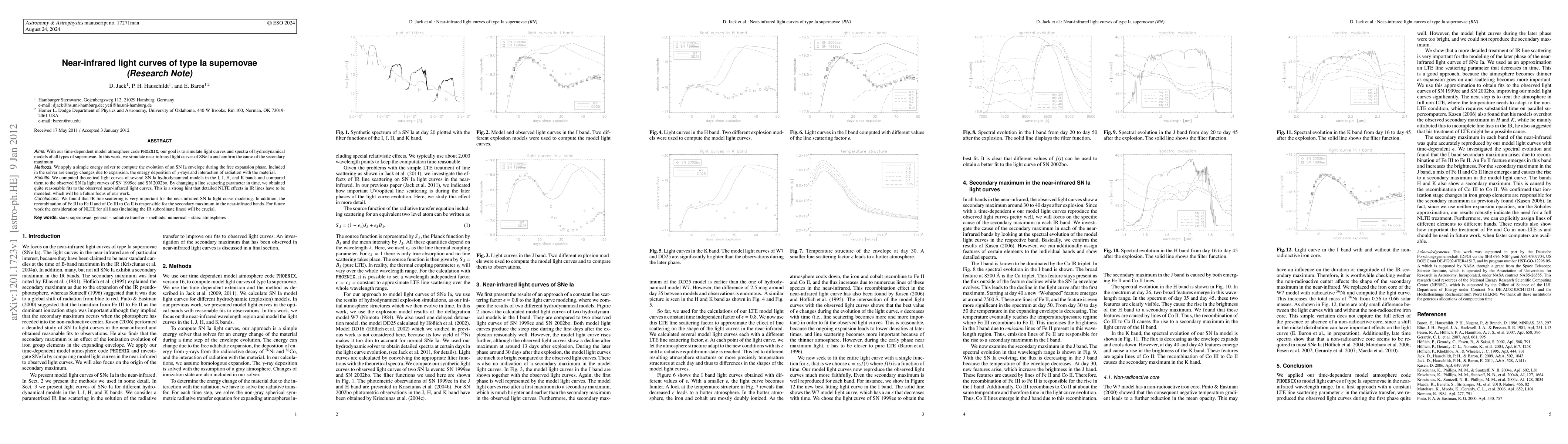 This paper uses the PHOENIX model atmosphere code to simulate near-infrared light curves of Type Ia supernovae, identifying IR line scattering as crucial for accurate modeling. The study attributes the secondary maximum in the light curves to the recombination of Fe III to Fe II and Co III to Co II, highlighting the need for future modeling of non-local thermodynamic equilibrium (NLTE) effects.