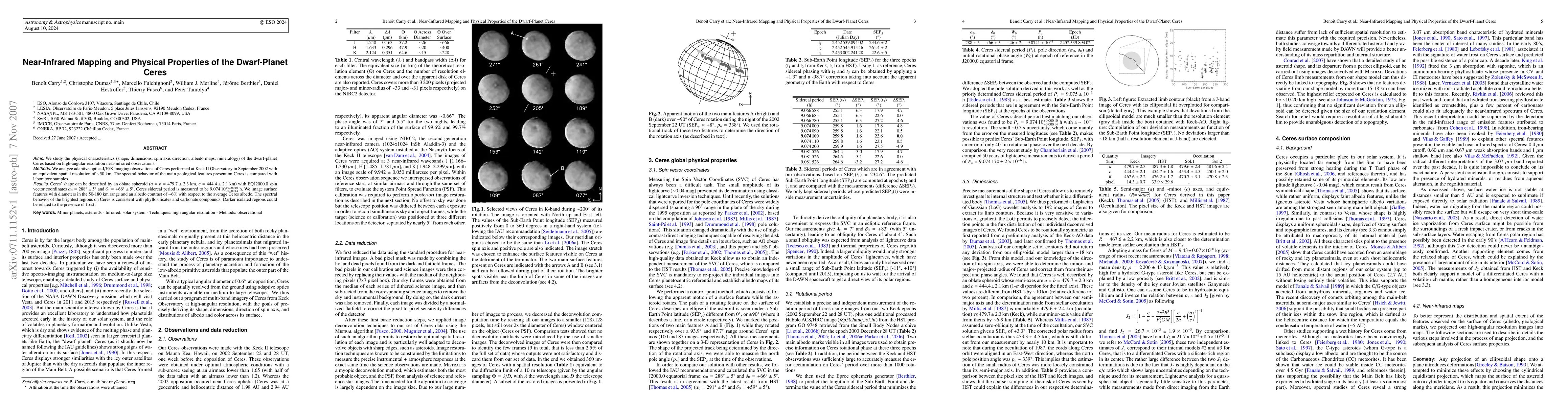 This study uses high-resolution near-infrared observations to map Ceres' physical properties, revealing an oblate spheroid shape with dimensions of 479.7 x 479.7 x 444.4 km. Spectral analysis indicates the presence of phyllosilicates and carbonates in bright regions, while darker areas may contain frost.